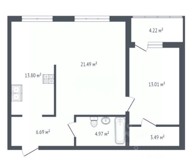 * Удачная прямоугольная планировка: легко зонировать на спальню и кухонно-гостевую часть.