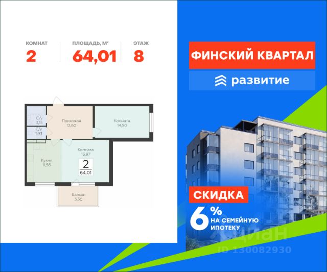 Продается квартира площадью 56.05 кв. м без отделки. Квартира расположена на 3 этаже 8 этажного дома, в жилом комплексе комфорт-класса "Финский Квартал". "Финский квартал" - это уникальный проект комфорт-класса для тех, кто хотел бы жить на природе, но при этом находиться вблизи Северной столицы. Расположенный в окружении одного из самых крупных парков Ленобласти - Лахтинского, проект предлагает своим жителям доступную инфраструктуру, комплексное благоустройство территории, 6 секций переменной этажности с современной архитектурой, которая гармонично дополнит район и будет радовать проживающих еще много лет. Найдите свою идеальную квартиру в ЖК "Финский Квартал"! Расположение Пешком: - 5 мин. до детского сада и супермаркета; - 8 мин. до остановки "Зеленая улица"; - 10 мин. до лесопарковой зоны. На автомобиле: - 3 мин. до Приозерского шоссе; - 10 мин. до Выборгского шоссе; - 12 мин. до КАД; - 30 мин. до ст. метро "Проспект Просвещения". Благоустройство - большой яркий двор с ландшафтным дизайном; - живая изгородь, кустарники и хвойники; - умное зонирование тихих и активных площадок; - сквер для прогулок и отдыха; - изумрудные лужайки для пикников; - дорожки для пешеходов и велосипедистов; - большие игровые площадки; - мягкое покрытие для безопасности детей; - тренажеры, турники и веревочные комплексы; - пространство только для пешеходов - без машин; - наземная парковка за пределами двора; - специальные площадки для выгула питомцев; - светлые дизайнерские холлы; - светопрозрачное остекление и большие окна; - декоративная подсветка парадных; - колясочные помещения для комфорта родителей; - места для хранения велосипедов и самокатов. Окружение - свежий воздух: парк усадьбы "Осиновая Роща", Лахтинский парк, лесопарк "Курортный", Левашовский заказник, Ново-Кавголовский лесопарк; - водные объекты: Сестрорецкий Разлив, пляжи у Тохколодского и Большого озер, залив Сярюнлахти; - инфраструктура: 2 детских сада, школа, кафе, продуктовый супермаркет, больница; - для крупных покупок: ТРЦ "Китай-Город", "Мега-Парнас"", "Гранд Каньон"; - активный отдых: горнолыжные комплексы "Охта-Парк" и "Токсово", конный клуб "Осиновая Роща", ФОК "Норус".