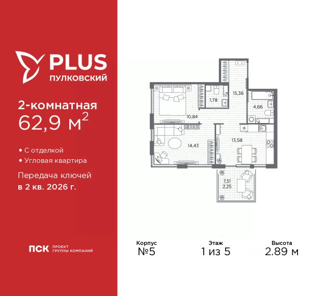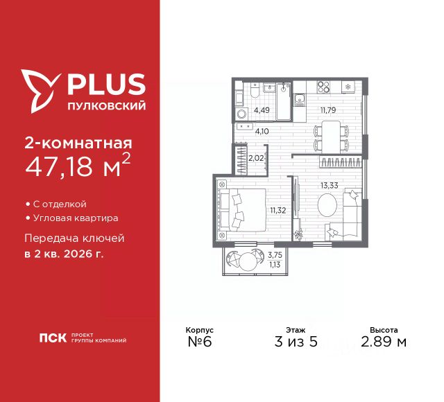 Просторная 2-комн. квартира с отделкой в ЖК "PLUS Пулковский" на 2 этаже. Общая площадь: 54.72 кв.м., жилая: 25.27 кв.м., площадь просторной кухни-столовой: 13.58 кв.м. Угловая квартира, очень светлая, естественная вентиляция при открытии окон. В квартире один совмещенный и один раздельный санузел. Высота потолков 2.89 м. Все квартиры в проекте сдаются с полной чистовой отделкой. Выполняется в двух стилистических решениях светлый стиль и темный современный стиль. Вам остается только расставить мебель. Важное преимущества отделки от застройщика в гарантии на все работы и в том, что фактическая стоимость полной отделки распределяется в ипотечных платежах при покупке в ипотеку. Дом монолитный, трехподъездный, высотой 5 этажей. Квартира находится в 3-й секции в корпусе 5. На этаже 5 квартир. В подъезде 1 грузовой лифт. Окончание строительства - 2 квартал 2026 года. Оформление сделки по договору долевого участия. ЖК "PLUS Пулковский" расположен в престижном Московском районе на пересечении Пулковского и Волхонского шоссе, по которым можно быстро добраться до КАД и до станций метро Московская и Звёздная. Поблизости расположены дворцово-парковые ансамбли Пушкина, Павловска, Петергофа, Гатчины, Ломоносова, а также вся торговая и развлекательная инфраструктура: ТК Лето, Outlet Village Pulkovo, Пулково-3, гипермаркеты Лента, Окей, Metro. На территории комплекса будут построены средняя образовательная школа на 825 мест с двумя бассейнами, 2 детских сада на 220 мест каждый. В детских садах тоже будут бассейны. Кроме этого будет построен медицинский центр для взрослых и детей. Во дворах буду оборудованы спортивные и безопасные детские площадки, на первых этажах домов будут расположены коммерческие помещения. Для автолюбителей будут подземные и наземный паркинги. Для жителей домов будет доступно "приложение жителя", которое предоставит такие возможности: — дистанционное открытие дверей в парадную и на территорию комплекса, — просмотр изображений с видеокамер, — контроль за показаниями счетчиков, — коммуникация с УК. Показания всех счетчиков будут собираться дистанционно. В квартирах будет выполнена коллекторная разводка отопления в стяжке пола от коллекторов в межквартирных коридорах. Застройщик ЖК "PLUS Пулковский" - группа компаний ПСК, которая является одной из ведущих девелоперских компаний Санкт Петербурга. Более 16 лет она возводит в Северной столице качественное жилье премиум, бизнес и комфорт-класса, социальные объекты школы и детские сады, апарт-комплексы и торговые центры и является четырехкратным обладателем золотого знака "Надежный застройщик России". #2weAE5