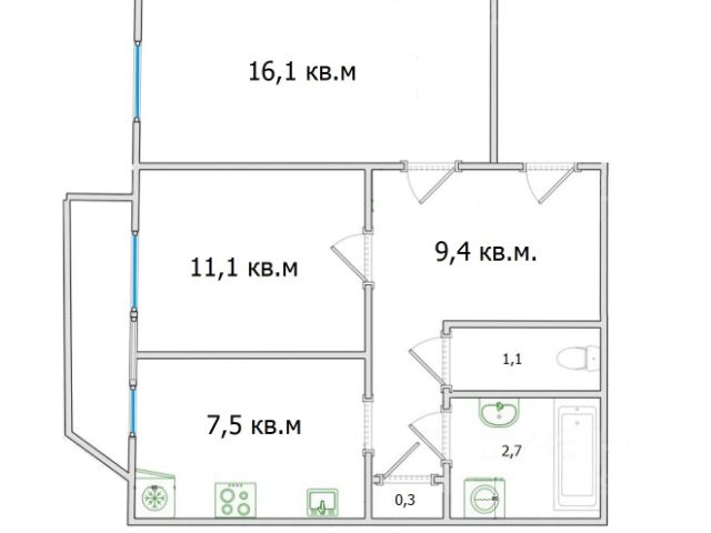 Раздельные комнаты 16,1 и 11,1 кв.м.. Кухня 7,5 кв.м. Большие окна.