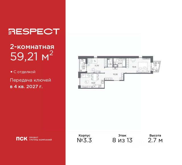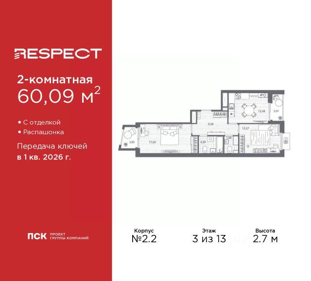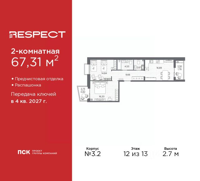 Двухкомнатная квартира с предчистовой отделкой в ЖК "RESPECT" на 8 этаже. Общая площадь: 67.31 кв.м., жилая: 31.04 кв.м., площадь просторной кухни-столовой: 16.89 кв.м. Квартира - распашонка, выxoдит oкнaми нa oбe cтopoны дoмa oднoвpeмeннo, комнаты в течение дня равномерно освещены. В квартире один балкон и одна лоджия, один совмещенный и один раздельный санузел. Высота потолков 2.7 м. Квартира будет сдана с отделкой WHITE BOX, в которую включены следующие виды работ: - заливка стяжки; - установлена система отопления квартиры; - подготовлены потолки; - все стены выровнены, загрунтованы и отштукатурены; - электрическая проводка разведена по комнатам. Квартира будет готова к чистовой отделке. Дом монолитный, многоподъездный, переменной этажности, от 10 до 13 этажей. Квартира находится в 1-й секции высотой 13 этажей в корпусе 3.2. На этаже 5 квартир. В подъезде 1 пассажирский и 1 грузовой лифт. Начало строительства - 3 квартал 2025 года. Окончание строительства - 4 квартал 2027 года. Оформление сделки по договору долевого участия. В шаговой доступности от жилого комплекса находятся станции метро (расстояние по прямой): "Лесная" (800 м), "Площадь Мужества" (1.4 км), "Выборгская" (1.9 км), также недалеко от этого корпуса расположены станции метро: "Академическая", "Политехническая". Жилой квартал "RESPECT" строится на Полюстровском пр, 87, в одной из самых востребованных локаций Петербурга. В 10 минутах пешком - метро "Лесная" и в 10 минутах на транспорте - Петроградская сторона. Высота домов от 7 до 13 этажей. Квартиры сдаются с отделкой white box и с чистовой отделкой. На территории Respect строится школа на 1125 учащихся и детский сад на 240 мест. Запроектированы собственная газовая котельная, закрытая территория, дворы без машин и подземные паркинги с лифтами. В проекте предусмотрены трапециевидные балконы или остекленные лоджии, которые, с одной стороны, исключают монотонность фасада, являясь декоративными элементами, с другой дополнительным функциональным пространством в квартирах. Цветовая гармония фасадов каждого дома раскрывает характер квартала. Коричневый цвет клинкерного кирпича со структурой водяных штрихов — цвет уюта и безопасности, сдержанности и надёжности. Вентилируемые фасады облицованы клинкерным кирпичом. Его высокая прочность позволяет давать 100 лет гарантии на этот материал. Водопоглощение клинкерного кирпича составляет менее 5%, за счет чего у него высокая теплопроводность и прочность. В квартале запроектированы внутренние закрытые территории дворов домов без доступа автомобилей и безбарьерная среда для велосипедистов и колясок. Предусмотрены IP-домофония с функцией дистанционного открывания калиток и парадных, а также дистанционный сбор показаний счетчиков и мобильное приложение для жителей. Для безопасности жителей квартала - круглосуточное видеонаблюдение и служба охраны. В каждой квартире предусмотрены внешние корзины для кондиционеров. Вся территория квартала будет связана единой концепцией благоустр