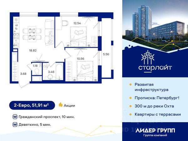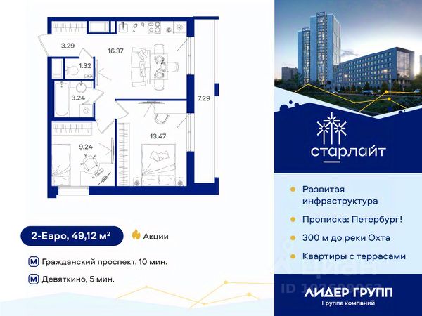 Продается 2-комнатная квартира в ЖК "Пейзажный квартал" на 10 этаже. Общая площадь составляет 50.50 кв. м. Квартира с чистовой отделкой. Жилой комплекс "Пейзажный квартал" располагается по адресу Санкт-Петербург, Красногвардейский Вдоль леса и рядом с рекой Охта. К 2026 году на берегах реки Охты будет создан Пейзажный парк с летними экотропами и зимними горками для тюбингов, скейт-парком и летним кинотеатром. Расположение: • 15 минут на авто до КАД; • 20 минут на авто до станций "Гражданский проспект" и "Академическая"; • 20 минут до ж/д станции "Ручьи"; Небольшой уютный квартал является частью масштабной застройки ЖК "Цветной город", и в то же время стоит обособленно от шумных массивов. Квартал граничит с новейшим объектом городской экосистемы - Пейзажным парком. Соседние кварталы уже застроены и заселены, поэтому здесь нет проблем с привычной городской инфраструктурой - работают детские сады и школы, открыты магазины и кафе, фитнес-клубы, студии красоты и пространства для творчества и отдыха. Преимущества: • Жизнь вблизи природы, но с городской пропиской; • Система "Умный дом" (в т.ч. управление домофоном со смартфона); • Сквозные парадные с колясочными помещениями; • Детский сад на 170 мест и школа на 300 учеников на территории ЖК; • Двор без машин. Успейте приобрести квартиру на выгодных условиях! Чтобы узнать подробности, обращайтесь за консультацией по телефону.