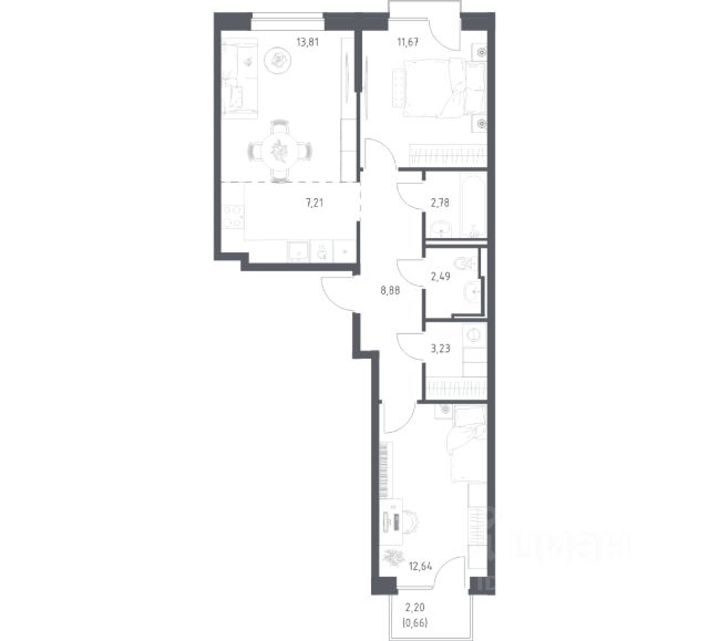 Квартира отличной планировки. Это не просто двушка, а евротрешка. При входе в квартиру есть ниша (есть в план изначально), которая сейчас оборудована в шкаф-купе для хранения. Также есть вместительная гардеробная для хранения, чтобы не загромождать комнаты шкафами. Огромная кухня-гостинная 17,5 кв.м., где с удовольствием семья может проводить вечера за семейным ужином. Изолированные комнаты - 17,8 кв.м. и 11,8 кв.м., детская и спальня. В квартире 2 сан.узла, один из которых переделан в гардеробную, которая при входе.
