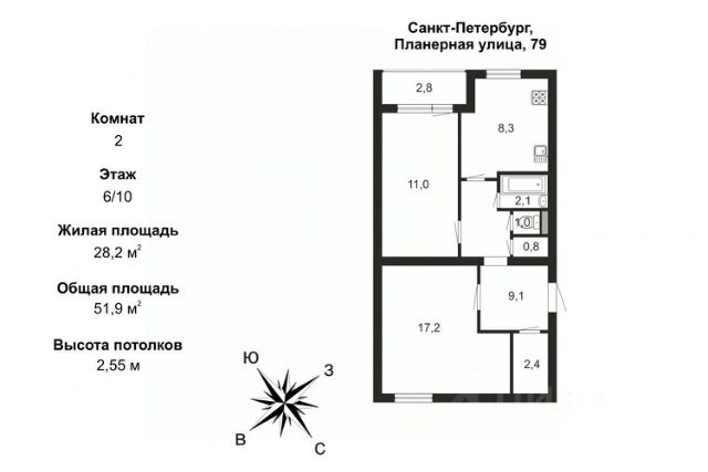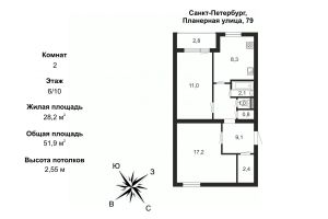 В продаже просторная 2к.кв. общей площадью 51,9 кв.м. Один собственник! Полная стоимость в договоре! Подходит под ипотеку и мат. Кап! Встречная покупка! ПРО КВАРТИРУ: 2к.кв Площадью 51,9 кв.м., просторные комнаты 17,2 кв.м. и 11,0 кв.м. с выходом на застекленную лоджию 2,8 кв.м., кухня 8,3 кв.м. с кухонным гарнитуром., сан.узел раздельный. Две большие кладовые. Бонусом кухонный гарнитур остается в Подарок новым жильцам. Квартира выходит на две стороны, из окн видна башня Газпром, одна комната выходит во двор. Квартира Не требует вложений, можно заехать и жить. Парадная в доме чистая, ухоженная, соседи хорошие. ПРО ЛОКАЦИЮ: В пешей доступности есть все: рядом школа, детские сады, детские площадки во дворе. Продуктовые сетевые и фермерские магазины, кафе, аптека, ТЦ. В 5 минутах Юнтоловский заповедник и Изотовский сквер. До метро Комендантский пр за 15 мин можно доехать на автотранспорте. Удобная локация, в двух минутах ходьбы остановки общественного транспорта, рядом выезд на ЗСД, до центра города 20 минут на машине ПРО ДОКУМЕНТЫ И СДЕЛКУ: Один взрослый собственник, срок владения более 5 лет; Полная Сумма в договоре — нет "занижений" и прочих схем; Мат. Капитал не использовался; Встречная покупка. Звоните, я буду рада ответить на любые вопросы. До встречи на просмотре. Номер объекта: #1/537146/24690