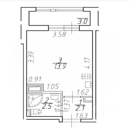 • Комната: Огромная, 21,7 м². Поместится и спальная зона, и гостиная, и рабочее место.