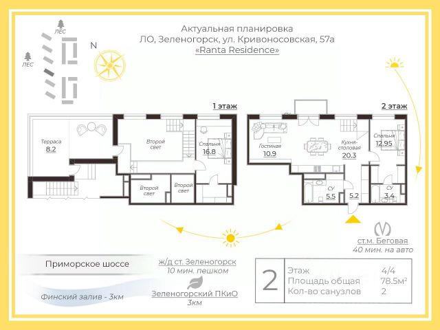 Просторная двухкомнатная квартира - Family- формат, в которой продумана каждая деталь для проживания семьи. Особенности лота: вид на лес панорамные окна потолки 3 м большая кухня-гостиная гардеробная два санузла отделка White Box. ИНДИВИДУАЛЬНЫЕ УСЛОВИЯ РАССРОЧКИ! ВЫГОДНАЯ ЦЕНА ПРИ 100% ОПЛАТЕ! Загородная жизнь с городским комфортом! Малоэтажный ЖК и небольшое количество квартир на этажах создают атмосферу приватной резиденции. В ЖК бизнес-класса Ranta Residence нет студий: все квартиры имеют площадь от 36 м² до 99 м². Прописка Санкт-Петербург. БЛАГОУСТРОЙСТВО Закрытая охраняемая территория, современный ландшафтный дизайн от студии L.Buro, натуральные материалы в обустройстве, а также резидентам ЖК будут доступны: теннисный корт на крыше паркинга; коворкинг под открытым небом; финский павильон с живым очагом и шезлонгами; павильон с барбекю; гамаки, скамейки и лежаки; спортивные и детские площадки; три прогулочные аллеи, амфитеатр; водный арт-объект; сад скульптур и пряных трав. ИНФРАСТРУКТУРА Мы создаём атмосферу закрытого клуба и интересного комьюнити, только для резидентов ЖК будут доступны: Бэби-клуб с детской комнатой и заботливой няней; Спортивный зал с тренажерами; Зал для йоги и стретчинга; Коворкинг; Кофейня; Собственный детский сад и начальная школа. В пешей доступности расположены: ТЦ Курортный Продуктовые магазины Перекресток и Пятерочка Аптека Кафе быстрого питания 4 школы и 3 детских сада Взрослая и детская поликлиники Рестораны и парки. ЛОКАЦИЯ ЖК бизнес-класса Ranta Residence расположен в экологически чистом Курортном районе Санкт-Петербурга, занимает участок площадью 5,4 Га по адресу: г. Санкт-Петербург, г. Зеленогорск, ул. Кривоносовская 57Д. ЖК Ranta Residence граничит с лесным массивом, также поблизости находятся: Государственный природный заказник "Озеро Щучье"; Золотой пляж; Комаровский берег; Зеленогорский парк культуры и отдыха; Горнолыжный курорт Пухтолова гора всего в 15 минутах на автомобиле . Съезда на ЗСД находится в 18 км, до ближайшей станции метро Беговая путь на автомобиле займет в среднем 50 минут, а до центра Санкт-Петербурга путь составит в среднем 60 минут. От ЖК Ranta Residence до центра Санкт-Петербурга около 60 км (по Зеленогорскому или Приморскому шоссе — они идут параллельно). До "Лахта-центра" 45 км и 45 минут в пути. В 15 минутах от ЖК на Вокзале Зеленогорск можно сесть на Ласточку, которая за 55 минут доезжает до Финляндского вокзала, там же есть автобусная остановка, от которой можно доехать к станциям метро Беговая и Черная речка" - этот путь займёт около 1,5 часа. Хотите узнать подробности? Звоните в Отдел продаж, наши специалисты ответят на все интересующие вас вопросы! #Зеленогорск, #Курортный район, просторная планировка, #малоэтажный, закрытый охраняемый двор, #бизнес-класс, панорамные окна, потолки 3 метра.