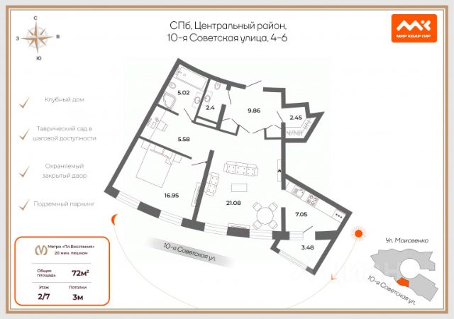 Приобретая эту квартиру, Вы приобретаете редкую возможность в удобное для Вас время полюбоваться величественным мостом Петра Великого, побродить по живописным набережным реки Невы, погулять по тенистым аллеям Таврического сада.
