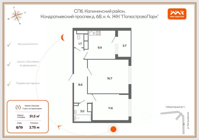Вы смотрите именно на такую — 2-комнатную квартиру 67,6 м² в ЖК "Полюстрово Парк".