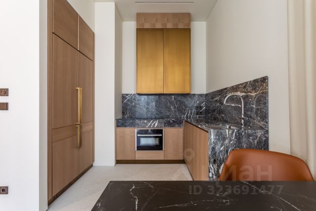 Кухня совмещена с гостиной. Панели шкафов в полную высоту стен, отделанные тонированным ореховым шпоном, со встроенной техникой. Мраморные столешница и фартук с шлифовальной текстурой. Каменный пол с подогревом. Встроенная бытовая техника: варочная панель BOSCH, ПММ, духовой шкаф, холодильник от NEFF. СМА и сушка от BOSCH. Смеситель GROHE Red Duo с бойлером горячей воды. Вся техника 2021 г с паспортами.