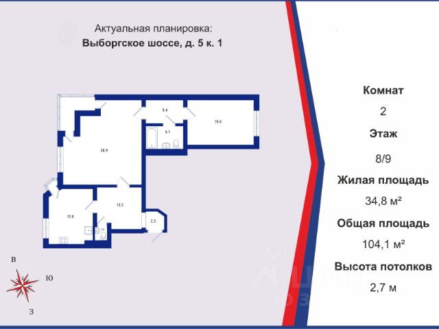 Просторная 2х комнатная квартира (104,1 м²) с дизайнерским ремонтом. Локация: 5 минут пешком от м. Озерки, напротив Суздальских озёр и парков. О квартире: - Площадь 104,1 м², 8/9 этаж кирпичного дома (застройщик — СтройТрест). - 2 изолированные комнаты (15,8 м² и 19 м²) с выходом на балкон. - Кухня-гостиная 39 м² с выходом на лоджию идеально для приёма гостей. - Раздельный санузел с джакузи и сауной + гостевой санузел. - Просторный холл (13,2 м²), прихожая (2,2 м²). - Все окна во двор (3 стороны света) тишина и зелёный вид. - Кондиционеры во всех жилых зонах. - Современный ремонт (все готово к проживанию). - Продаётся с мебелью и техникой (как на фото). О доме: - Подземный паркинг + охраняемая территория. - Консьерж, видеонаблюдение безопасность 24/7. - Двор с детскими площадками, без машин. - Капремонт крыши (2011 г.). - Паркинг подземный во дворе, вокруг дома свободные места стоянок. Юридические аспекты: - 2 собственника (взрослые), прямая продажа. - обременений НЕТ, долгов НЕТ, маткапитала НЕТ, возможна ипотека. - Документы: ДКП (договор купли-продажи). Инфраструктура: - Школы/сады: Гимназия 622 (с бассейном) прямо у дома, детсады, поликлиники. - Торговля: Окей, Перекрёсток, Лента, ТЦ Вояж и Озерки. - Развлечения: кинотеатр, фитнес-клубы, бассейны. - Отдых: Суздальские озёра, парки Сосновка, Муринский, Новоорловский заказник. 2-комнатная квартира (вторичка) на шоссе Выборгское в Санкт-Петербурге.