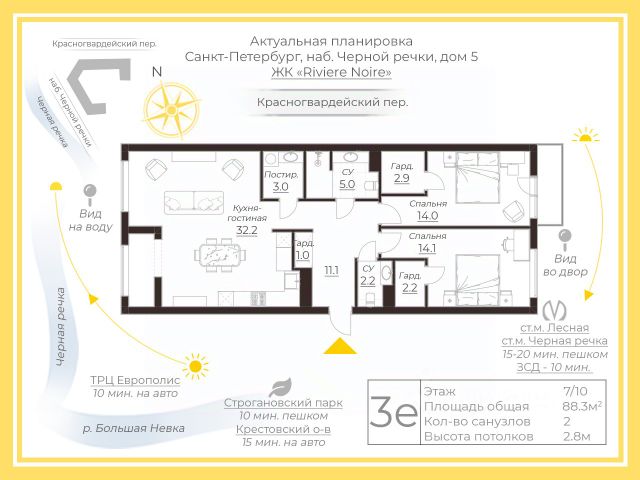 Инфраструктура в 5-10 мин пешком: садик, школа, ТЦ "Северный Молл", поликлиника, стадион, банки, супермаркеты. До метро "Черная Речка" и Лесная - 15 мин пешком или 5 мин на транспорте, рядом парки, набережная большой Невки, Петроградский остров через мост.