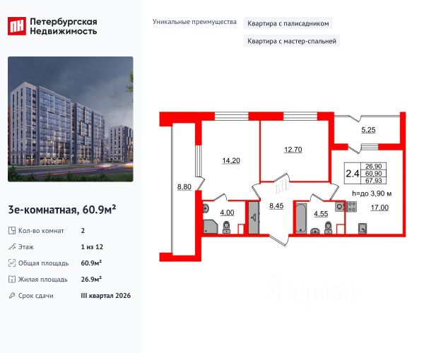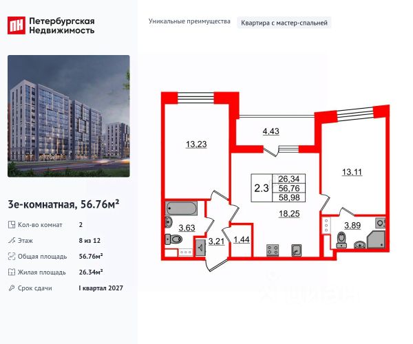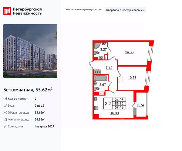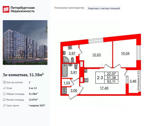 Продается уютная 2-комнатная квартира от застройщика в жилом комплексе "Бионика Заповедная" в динамичном Приморском районе. До метро можно добраться на транспорте всего за 11 минут. Мастер-спальня с собственной ванной комнатой. Самое приватное пространство в вашей квартире. Уникальная, функциональная европланировка, большая кухня-гостиная 17.4 м², вместительная прихожая 3 м². Общая площадь квартиры - 51.38 м², жилая 22.07 м², высота потолка 2.77 м. Квартира продается с отделкой "Норд Лайн серый плюс". Что особенного в ЖК "Бионика Заповедная"? • Оазис в городе 3 минуты пешком до Новоорловского заказника (140 ГА) • Захватывающие виды из окон на хвойный лесопарк • Всесезонный "Заповедный парк" во дворе площадью 23000 кв.м. • 5 единых входных групп с авторским дизайном и лаундж-зонами, сити-виллы на первых этажах с палисадниками и высотой потолков до 4 м • Места притяжения: фонтан "Бионика", спортивный кластер со скейт-парком, фотозоны с арт-объектами