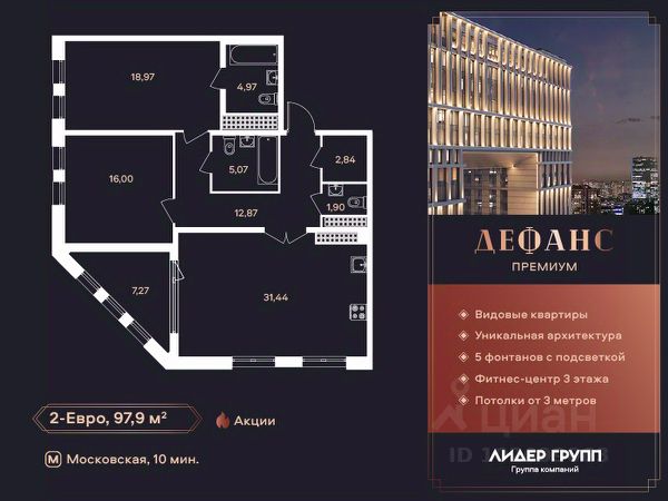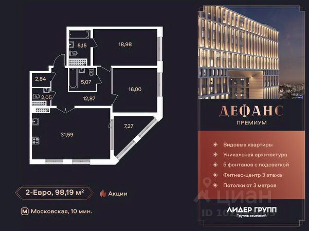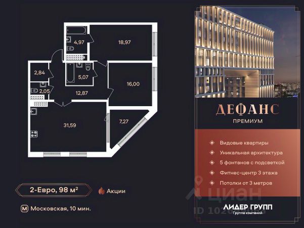 ЖК "Дефанс Премиум". Строительство завершено. Дом получил заключение о соответствии и готовится к вводу! Это проект авторской архитектуры с уникальными форматами квартир в 10 минутах ходьбы от станции метро "Московская". Дом выполнен в виде двух 23-х этажных арок, основания которых объединены единым внутренним пространством с большой парадной лестницей, променадом и большим фонтанным комплексом с подсветкой. В составе проекта построен большой фитнес-центр с бассейнами и зоной СПА. Часть квартир отделена от остальных жилых этажей специальным техническим этажом — это снимает все ограничения по перепланировке. Для части квартир предусмотрены индивидуальные входные группы и дополнительные лифты премиального немецкого бренда Tyssen Krupp (TKE). Фасады, облицованные испанской керамикой и алюминиевые панорамные окна с энергоэффективными стеклами AGС Energy подчеркивают высокий статус дома. На квартиры ЗПИФ и переуступки семейная ипотека не распространяется!