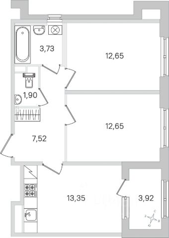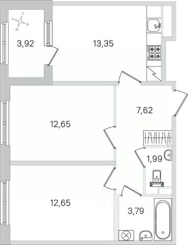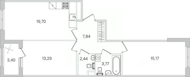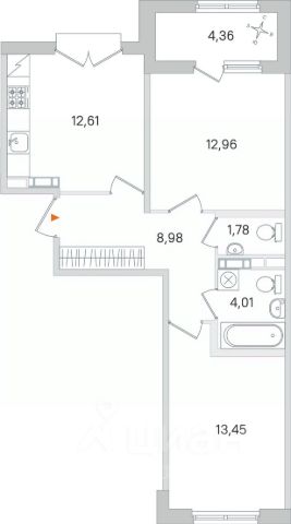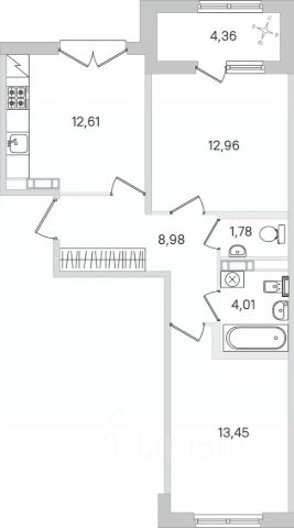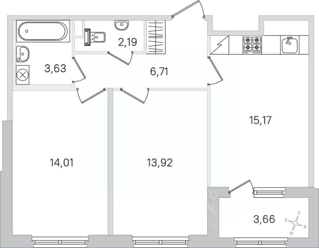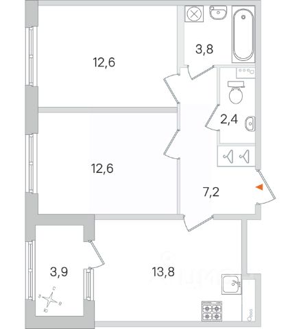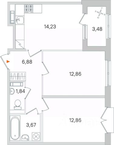 Эргономичная планировка: кухня-гостинная - 19,5 кв.м с выходом на балкон 3,6 кв.м., две квадратная комната 14,3+14,3 кв.м.