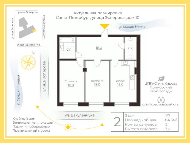 Арт. 111879275 СОЛНЕЧНАЯ КВАРТИРА В ДОМЕ ПРЕМИУМ-КЛАССА НА КРЕСТОВСКОМ Представляем вашему вниманию тихую, двухкомнатную квартиру в клубном доме премиум-класса Esper Club! Светлая, семейная квартира, площадью 84 кв\м и высотой потолков 3 метра включает в себя: Просторную кухню, где вы будете собираться всей семьей, Две спальни по 18 кв\м; Два больших санузла; Большую, широкую прихожую 18 кв\м. Все окна выходят в тихий двор, на улицу Вакуленчука. Вы будете жить в комфорте и спокойствии! Предчистовая отделка своими характеристиками отлично подходит для самых интересных планировочных решений. Вы сможете сделать планировку на ваш вкус! Установлены: Двухкамерные дубовые стеклопакеты; Дубовая стильная входная дверь, Система многоступенчатой очистки воды. Esper Club Элитный клубный дом, расположенный в тихой части Крестовского Острова, в окружении парков и рек. В доме всего 68 квартир. Изюминка дома великолепный холл с камином и зоной отдыха, где по традициях лучших пятизвездочных отелей своя круглосуточная служба портье, с которой вы решите любые бытовые вопросы вы высшем уровне: сервис горничных; химчистка; доставка еды; покупка ж/д и авиабилетов, билетов в театры, музеи и на выставки; вызов такси; курьерские услуги и многое другое. Круглосуточная служба охраны, контроль доступа, современные инженерные решения. Вы будете жить в приватности, комфорте и безопасности и этом получать эстетическое удовлетворение как от внутренней части дома, так и его внешнего вида! Премиальное и благополучное расположение среди садов, парков и водоемов, однородное социальное окружение подчеркивает высокий статус дома. Вы будете жить в самой зеленой и экологически чистой локации города! Здесь абсолютная безопасность, элитные частные школы, яхт-клубы и лучшие рестораны делают Крестовский остров таким притягательным для жизни! Удобная транспортная доступность: до Дворцовой набережной вы доберетесь за 15 минут, а до аэропорта "Пулково" за полчаса. Великолепный клубный дом; самая статусная локация; светлая, семейная квартира выделяют это предложение. Звоните сейчас! 2-комнатная квартира в ЖК Esper Club в Санкт-Петербурге.