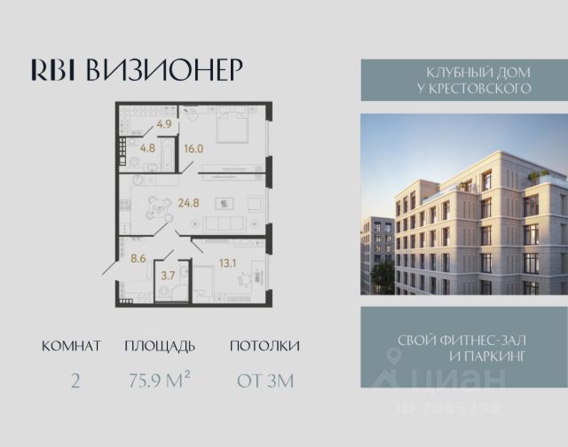 "Визионер" — новый дом элит-класса от RBI в самой престижной локации Петербурга на Петроградской стороне. Рядом — парки Крестовского и Петровского островов, яхт-клубы, бизнес-центры, частные школы и бутики Большого проспекта Петроградской стороны. Камерность поддерживается за счёт деления дома на три разновысотных корпуса и небольшого количества квартир — в доме их всего 225, от 32 до 147 м². Планировки — с большими кухнями-гостиными, мастер-спальнями и функциональными эркерами. На верхних этажах — квартиры с потолками 3,3 м и видовыми террасами: отсюда открывается вдохновляющая панорама исторического окружения Средней Колтовской и Глухой Зелениной улиц. В квартирах — большие алюминиевые окна с накладками из массива дерева. Все лоты продаются без отделки. Элегантное сочетание матового клинкерного кирпича и линеарных объёмов фасадов отсылает к характерным конструктивистским нюансам промышленной архитектуры исторического Петербурга, в особенности здания силовой подстанции фабрики "Красное Знамя", которое располагается рядом. Мягкие линии скруглённых углов гармонируют с плавными изгибами эркеров, а акцентный портал парадного входа приглашает в лобби, сквозь витражные окна которого открывается новая перспектива знакомой локации. Специально для "Визионера" архитектор Евгений Герасимов разработал эксклюзивный паттерн по типу шахматной клетки. Этот орнамент отражает особый визионерский нрав дома и прослеживается не только в перфорированных панелях, которые структурируют пространство лобби, но и в декоративных нишах фасада. Ещё одним украшением парадного вестибюля станет серия интроспективных керамических панно художницы Юлии Клоповой: первое в своей визуальной форме воплощает интуицию, второе — стратегию. Для жителей оборудуют подземный паркинг на 153 машиноместа с усилением сигнала мобильной связи. На первом этаже — собственный фитнес-зал (158 м²) с выделенной зоной тренажёров, секцией для йоги, душевыми и оборудованным массажным кабинетом. В каждой парадной предусмотрены колясочные. Отдельно можно докупить кладовую. В приватном дворе разобьют пейзажный сад со взрослыми деревьями и многолетними кустарниками — всего 4500 растений, которые сохранят привлекательность круглый год. Здесь появятся деревянные скамейки, лёгкие металлические столы и стулья, уличные светильники-торшеры, чтобы во дворе можно было не только подышать свежим воздухом, но и поработать — свободный Wi-Fi на территории. В зоне "зелёной комнаты" установят уличные обогреватели. Детские игровые площадки удалены от мест релаксации и оборудованы развивающими элементами от Richter RUS. В Петербурге игровое оборудование Richter эксклюзивно представлено в домах RBI и в "Новой Голландии". Двор без машин полностью огорожен и охраняется круглосуточно. Вход на территорию — по бесконтактному цифровому ключу. "Визионер". Дом, достойный взглядов.