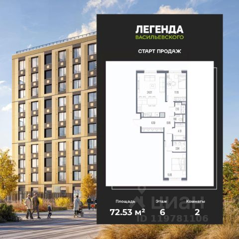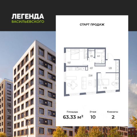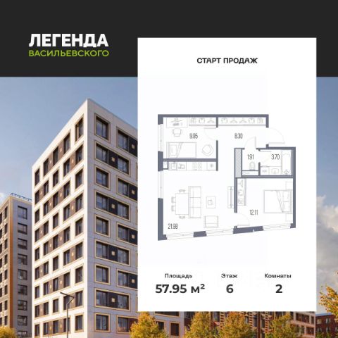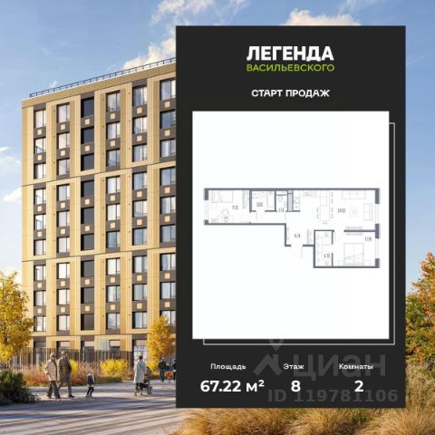 Продается 2-комн. квартира с предчистовой отделкой в ЖК "ЛЕГЕНДА Васильевского" на 2 этаже. Общая площадь: 60.64 кв.м., жилая: 22.59 кв.м., площадь просторной кухни-столовой: 18.14 кв.м. Комнаты изолированные, все окна выходят на одну сторону. В квартире два совмещенных санузла. Высота потолков 2.72 м. "ЛЕГЕНДА Васильевского" жилой квартал в минутной доступности от Финского залива, главного креативного хаба Санкт-Петербурга Севкабель Порта и других точек притяжения. Современные инженерные и технические решения, повышающие качество жизни TechnoBox включают в себя: стационарный и удаленный контроль дома, систему вентиляции Air Design - здоровое дыхание без лишнего шума, мультисервисную сеть, объединяющую коммуникационные системы, удаленное управление электроприборами, контроль отопления в каждом помещении, поддерживающий оптимальный температурный баланс во время "холодного" периода", датчики протечки, датчик открытия входной двери. Мультисервисная сеть (МСС) объединяет ключевые слаботочные системы дома, задавая им единый высокий стандарт работы, обеспечивая надёжность их функционирования и управления. Квартира готова к декорированию. Застройщиком сделана шумоизоляция; стены подготовлены для отделки; проведена электрика с учетом рекомендаций по расстановке мебели и бытовой техники; выровнен пол. В каждой квартире установлена взломостойкая входная дверь, окна со специальным термоизолированным алюминиевым профилем. Двор жилого комплекса "ЛЕГЕНДА Васильевского" закрыт. Проект состоит из шести разноформатных корпусов с ритмичными фасадами в духе пост-конструктивизма. Геометрия жилого комплекса состоит из четко простроенных осей, чередующих открытые пространства и объемы корпусов, каждый из которых обладает своим визуальным кодом индивидуальным рисунком фасада и цветовой палитрой. Корпуса образуют периметр с общественными пространствами: площадью с кафе, магазинами и пешеходным променадом с детскими игровыми хабами, местами для спокойного отдыха и workout-зоной. На территории комплекса предусмотрены теплый подземный паркинг и два наземных 4-х этажных паркинга.