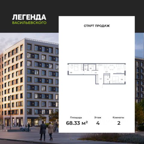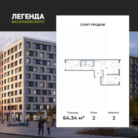 Продается 2-комн. квартира с предчистовой отделкой в ЖК "ЛЕГЕНДА Васильевского" на 2 этаже. Общая площадь: 60.64 кв.м., жилая: 22.59 кв.м., площадь просторной кухни-столовой: 18.14 кв.м. Комнаты изолированные, все окна выходят на одну сторону. В квартире два совмещенных санузла. Высота потолков 2.72 м. "ЛЕГЕНДА Васильевского" жилой квартал в минутной доступности от Финского залива, главного креативного хаба Санкт-Петербурга Севкабель Порта и других точек притяжения. Современные инженерные и технические решения, повышающие качество жизни TechnoBox включают в себя: стационарный и удаленный контроль дома, систему вентиляции Air Design - здоровое дыхание без лишнего шума, мультисервисную сеть, объединяющую коммуникационные системы, удаленное управление электроприборами, контроль отопления в каждом помещении, поддерживающий оптимальный температурный баланс во время "холодного" периода", датчики протечки, датчик открытия входной двери. Мультисервисная сеть (МСС) объединяет ключевые слаботочные системы дома, задавая им единый высокий стандарт работы, обеспечивая надёжность их функционирования и управления. Квартира готова к декорированию. Застройщиком сделана шумоизоляция; стены подготовлены для отделки; проведена электрика с учетом рекомендаций по расстановке мебели и бытовой техники; выровнен пол. В каждой квартире установлена взломостойкая входная дверь, окна со специальным термоизолированным алюминиевым профилем. Двор жилого комплекса "ЛЕГЕНДА Васильевского" закрыт. Проект состоит из шести разноформатных корпусов с ритмичными фасадами в духе пост-конструктивизма. Геометрия жилого комплекса состоит из четко простроенных осей, чередующих открытые пространства и объемы корпусов, каждый из которых обладает своим визуальным кодом индивидуальным рисунком фасада и цветовой палитрой. Корпуса образуют периметр с общественными пространствами: площадью с кафе, магазинами и пешеходным променадом с детскими игровыми хабами, местами для спокойного отдыха и workout-зоной. На территории комплекса предусмотрены теплый подземный паркинг и два наземных 4-х этажных паркинга.