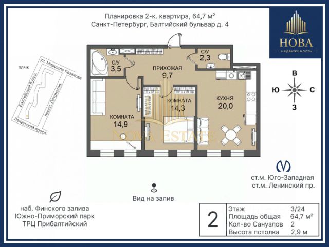 Открылась новая станция МЕТРО Путиловская и Юго-Западная.! Ваш шанс жить у моря! Просторная, светлая 2-комнатная квартира с панорамным видом на Финский залив в престижном ЖК "Паруса"! Представляем вашему вниманию великолепную квартиру, сочетающую в себе современный комфорт, удобное расположение и захватывающие виды на залив. Это идеальное место для тех, кто ценит качество жизни, безопасность и развитую инфраструктуру. О квартире: Видовая квартира: Наслаждайтесь панорамным видом на Финский залив с одной стороны и уютным видом во двор с другой. Ваша квартира будет залита солнечным светом благодаря двустороннему расположению окон (запад и восток). Простор и функциональность: Кухня: Большая и просторная кухня площадью 14.2 кв.м. идеальное место для кулинарных шедевров и семейных ужинов. Комнаты: Две изолированные комнаты площадью 14.56 кв.м. и 14.24 кв.м. предоставляют достаточно пространства для комфортного проживания. Санузел: Раздельный санузел, отделанный стильной плиткой, обеспечивает удобство. Коридор: Просторный коридор с возможностью установки вместительного шкафа-купе, который поможет организовать хранение. Готова к проживанию: Вся мебель и бытовая техника остается вам, что позволит вам сразу заехать и жить без дополнительных хлопот. О жилом комплексе "Паруса": Новый и престижный: ЖК 2018 года постройки, отличающийся современной архитектурой и высоким качеством строительства. Благоустроенная территория: Ухоженная придомовая территория, чистая и светлая парадная, приятные и хорошие соседи создают атмосферу комфорта и безопасности. Парковка: На территории ЖК имеется множество парковочных мест. Собственный пляж:Особым преимуществом является благоустроенный пляж, расположенный непосредственно у дома. Здесь есть всё для идеального отдыха: скамейки, шезлонги, качели, беседки и детские площадки. Развитая инфраструктура района: Для семей с детьми: В пешей доступности расположены 4 детских сада, 2 школы, детская поликлиника, множество детских развивающих центров. Здоровье и спорт: Недалеко находится клиника "21 Век",а также фитнес-залы и спортивные секции. Торговля и услуги: Непосредственно в доме:Магазин "Магнит", "Винлаб", "Красное и Белое", кафе и пекарни всё необходимое под рукой. В шаговой доступности:"ВкусВилл", "Перекресток", "Ермолино" и другие магазины. Крупный торговый центр: В 800 метрах расположен ТРК "Прибалтийский" Отдых и прогулки: Южно-Приморский парк и Дудергофский канал в 30 минутах ходьбы идеальные места для прогулок на свежем воздухе. Удобное расположение к пригородам: Всего 20 минут на авто до Стрельны, 30 минут до Петергофа. Транспортная доступность: Метро: Всего 10 минут транспортом до станции метро "Ленинский проспект". Общественный транспорт: Остановки общественного транспорта находятся в нескольких метрах от дома, обеспечивая удобное сообщение с различными районами города. Перспектива: В ближайшее время планируется открытие новой станции метро "Юго-Зарадн Продается 2-комнатная квартира 2-комнатных квартир в Паруса в Санкт-Петербурге.