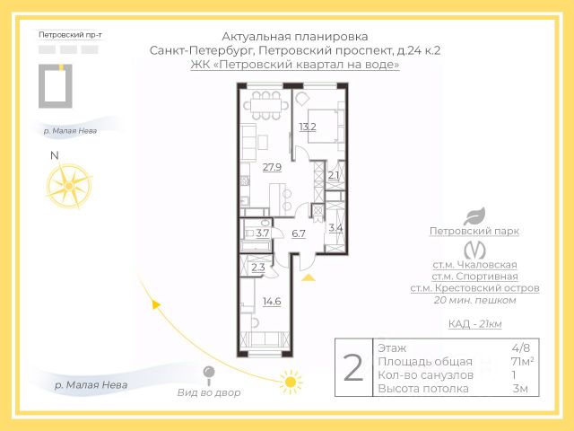 Петровский квартал на воде — уникальная локация, гармонично сочетающая современные тенденции архитектуры и дизайна с комфортом проживания в живописной природной среде. Предлагается к продаже стильная, комфортабельная и идеально продуманная квартира, отражающая самые высокие стандарты качества и удобства. Здесь каждый элемент интерьера создан для максимального комфорта и эстетического удовольствия. Интерьер квартиры отличается изысканным дизайном и безупречным вкусом. Пространство наполнено светом благодаря большим окнам, создающим ощущение простора и свободы. Стены украшают натуральные отделочные материалы высокого класса, подчеркивающие индивидуальность каждого помещения. Мебель и бытовая техника от ведущих мировых брендов придают интерьеру особую атмосферу роскоши и функциональности. Просторная гостиная с кухней располагает к приятному отдыху и дружескому общению. Два больших окна наполняют комнату естественным светом, создавая атмосферу уюта и тепла. Мастер-спальня оборудована удобной гардеробной и эргономичным рабочим кабинетом. Санузел оснащен качественной сантехникой известных марок. Особое внимание уделено техническим аспектам жилья. Установлена современная система вентиляции с функцией кондиционирования воздуха, гарантирующая оптимальный микроклимат круглый год. Бытовая техника премиум-класса BOSCH и Electrolux. Окна гостиной открывают живописный вид на зеленые насаждения, а спальню украшает прекрасный пейзаж водной глади. Дополнительно к квартире предлагается удобное парковочное место в подземном паркинге. Эта квартира станет идеальным выбором для тех, кто ценит качество, комфорт и красоту. Петровский квартал на воде располагается в Петроградском районе, прямо на берегу Малой Невки. Это одно из самых престижных мест города, которое привлекает своей близостью к историческому центру и уникальной водной перспективой. Рядом находятся все необходимые объекты инфраструктуры: супермаркеты, аптеки, салоны красоты, рестораны и кафе. Здесь также легко добраться до основных достопримечательностей Петербурга пешком или на общественном транспорте. До ближайших станций метро "Крестовский остров" - можно дойти всего за несколько минут. Панорамные окна открывают потрясающий вид на реку Малую Невку и Крестовский остров. Благодаря расположению рядом с водой воздух здесь свежий и чистый. Удобная транспортная развязка. Прогулки вдоль набережных, посещение музеев и театров создают особую атмосферу культурной столицы. Рядом находится парки, велодорожки и места для занятий спортом на открытом воздухе. 2-комнатная квартира в ЖК Петровский квартал на воде в Санкт-Петербурге.