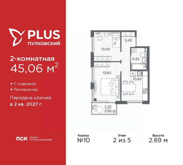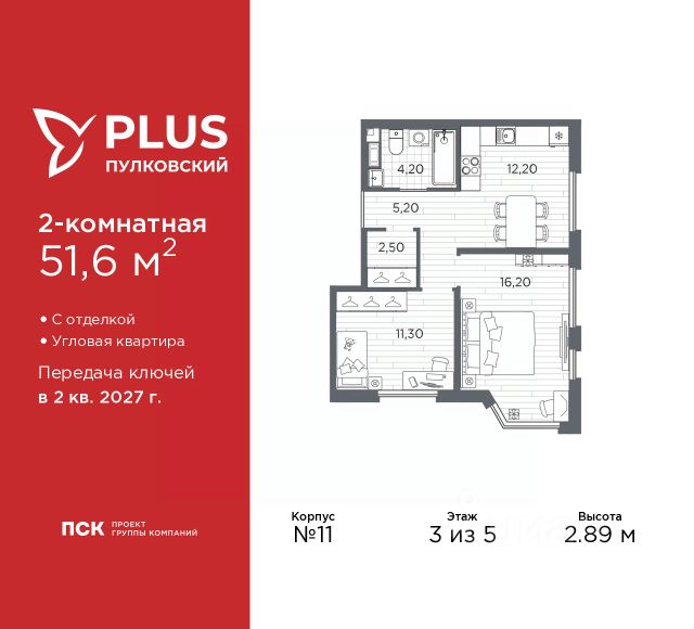 2-комн. квартира от застройщика с отделкой в ЖК "PLUS Пулковский" на 3 этаже. Общая площадь: 60.15 кв.м., жилая: 21.1 кв.м., площадь просторной кухни-столовой: 20.2 кв.м. Квартира угловая, идеально подойдет любителям тишины и панорамных видов. В квартире одна лоджия, один совмещенный и один раздельный санузел. Высота потолков 2.89 м. Дом монолитный, трехподъездный, высотой 5 этажей. Квартира находится в 3-й секции в корпусе 11. На этаже 9 квартир. В подъезде 1 грузовой лифт. Начало строительства - 1 квартал 2026 года. Окончание строительства - 2 квартал 2027 года. Оформление сделки по договору долевого участия. ЖК "PLUS Пулковский" расположен в престижном Московском районе на пересечении Пулковского и Волхонского шоссе, по которым можно быстро добраться до КАД и до станций метро Московская и Звёздная. Поблизости расположены дворцово-парковые ансамбли Пушкина, Павловска, Петергофа, Гатчины, Ломоносова, а также вся торговая и развлекательная инфраструктура: ТК Лето, Outlet Village Pulkovo, Пулково-3, гипермаркеты Лента, Окей, Metro. На территории комплекса будут построены средняя образовательная школа на 825 мест с двумя бассейнами, 2 детских сада на 220 мест каждый. В детских садах тоже будут бассейны. Кроме этого будет построен медицинский центр для взрослых и детей. Во дворах буду оборудованы спортивные и безопасные детские площадки, на первых этажах домов будут расположены коммерческие помещения. Для автолюбителей будут подземные и наземный паркинги. Для жителей домов будет доступно "приложение жителя", которое предоставит такие возможности: — дистанционное открытие дверей в парадную и на территорию комплекса, — просмотр изображений с видеокамер, — контроль за показаниями счетчиков, — коммуникация с УК. Показания всех счетчиков будут собираться дистанционно. В квартирах будет выполнена коллекторная разводка отопления в стяжке пола от коллекторов в межквартирных коридорах. Застройщик ЖК "PLUS Пулковский" - группа компаний ПСК, которая является одной из ведущих девелоперских компаний Санкт Петербурга. Более 16 лет она возводит в Северной столице качественное жилье премиум, бизнес и комфорт-класса, социальные объекты школы и детские сады, апарт-комплексы и торговые центры и является четырехкратным обладателем золотого знака "Надежный застройщик России". #zmCFUW