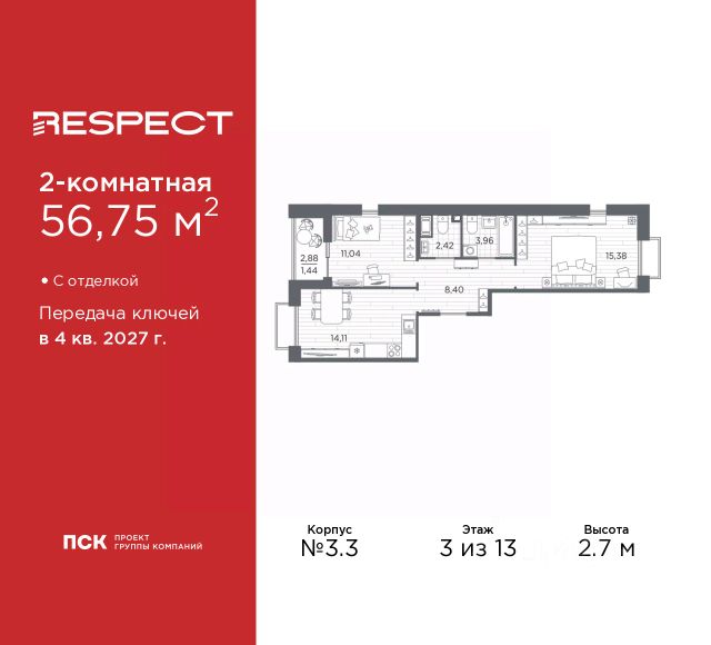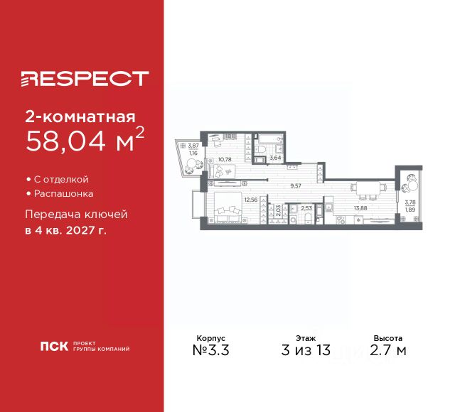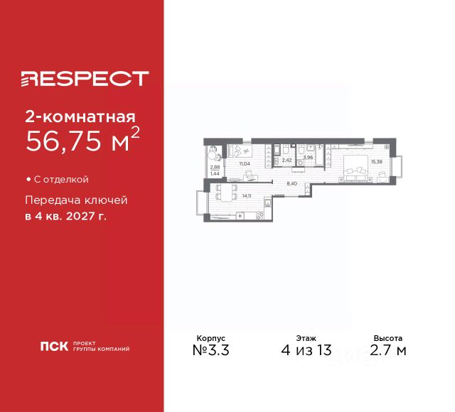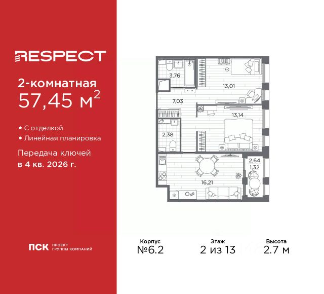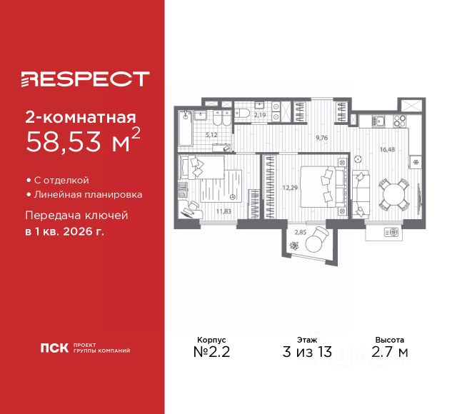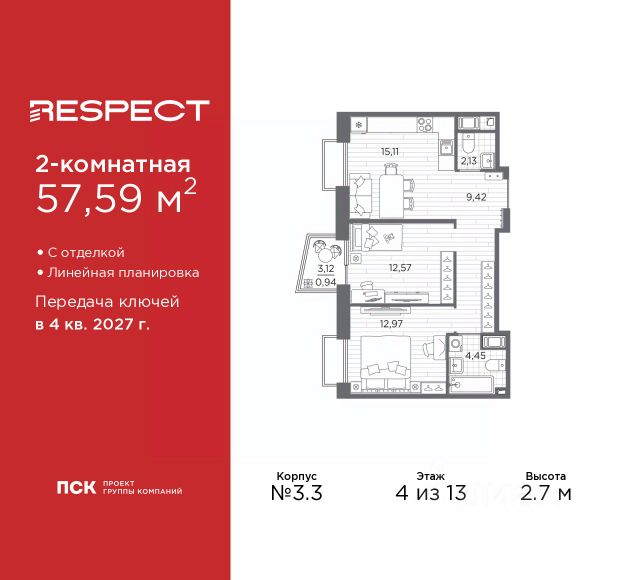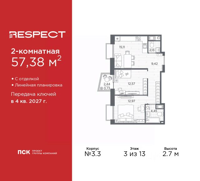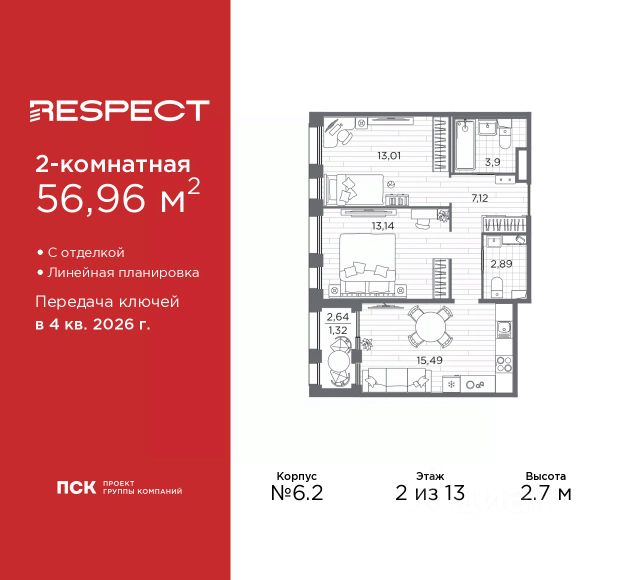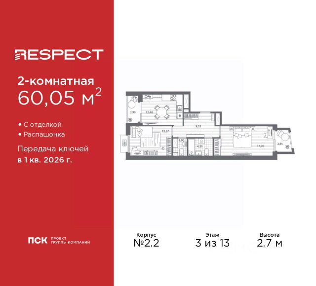 Двухкомнатная квартира от застройщика с предчистовой отделкой в ЖК "RESPECT" на 2 этаже. Общая площадь: 56.1 кв.м., жилая: 23.32 кв.м., площадь просторной кухни-столовой: 15.05 кв.м. Комнаты изолированные, все окна выходят на одну сторону. В квартире один балкон и одна лоджия, два совмещенных санузла. Терраса представляет собой роскошную зону отдыха для проведение вечеров в кругу семьи и друзей или организация вечеринок. Высота потолков 2.7 м. Квартира находится в корпусе 6. Дом монолитный, одноподъездный, высотой 13 этажей. На этаже 8 квартир. В подъезде 1 пассажирский и 1 грузовой лифт. Окончание строительства - 4 квартал 2026 года. Оформление сделки по договору долевого участия. В шаговой доступности от жилого комплекса находятся станции метро (расстояние по прямой): "Лесная" (800 м), "Площадь Мужества" (1.4 км), "Выборгская" (1.9 км), также недалеко от этого корпуса находятся станции метро: "Академическая", "Политехническая". Жилой квартал "RESPECT" строится на Полюстровском пр, 87, в одной из самых востребованных локаций Петербурга. В 10 минутах пешком - метро "Лесная" и в 10 минутах на транспорте - Петроградская сторона. Высота домов от 7 до 13 этажей. Квартиры сдаются с отделкой white box и с чистовой отделкой. На территории Respect строится школа на 1125 учащихся и детский сад на 240 мест. Запроектированы собственная газовая котельная, закрытая территория, дворы без машин и подземные паркинги с лифтами. В проекте предусмотрены трапециевидные балконы или остекленные лоджии, которые, с одной стороны, исключают монотонность фасада, являясь декоративными элементами, с другой дополнительным функциональным пространством в квартирах. Цветовая гармония фасадов каждого дома раскрывает характер квартала. Коричневый цвет клинкерного кирпича со структурой водяных штрихов — цвет уюта и безопасности, сдержанности и надёжности. Вентилируемые фасады облицованы клинкерным кирпичом. Его высокая прочность позволяет давать 100 лет гарантии на этот материал. Водопоглощение клинкерного кирпича составляет менее 5%, за счет чего у него высокая теплопроводность и прочность. В квартале запроектированы внутренние закрытые территории дворов домов без доступа автомобилей и безбарьерная среда для велосипедистов и колясок. Предусмотрены IP-домофония с функцией дистанционного открывания калиток и парадных, а также дистанционный сбор показаний счетчиков и мобильное приложение для жителей. Для безопасности жителей квартала - круглосуточное видеонаблюдение и служба охраны. В каждой квартире предусмотрены внешние корзины для кондиционеров. Вся территория квартала будет связана единой концепцией благоустройства, разработанной ландшафтным бюро L.BURO. На эксплуатируемой кровле на уровне первого этажа в домах 1 и 4 будут обустроены общественные видовые террасы. Это станет не только привлекательным местом с красивым видом, но и удобным, многофункциональным пространством. Дизайн парадных зон и входных групп - сочетание лаконичности отделки и декоративных