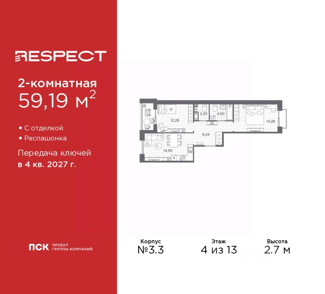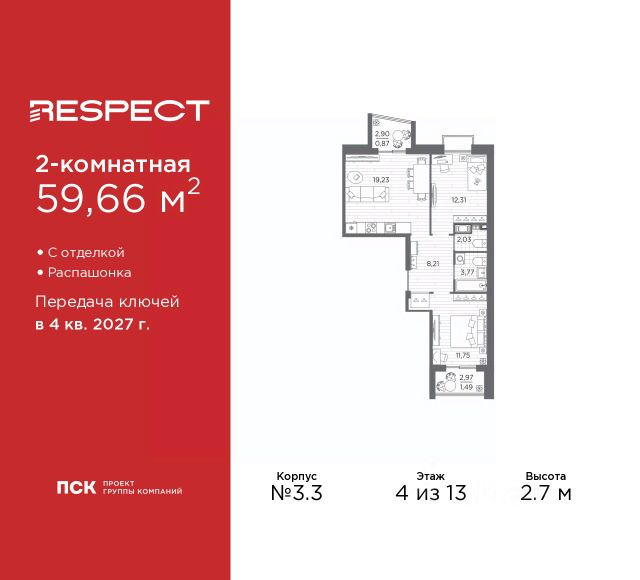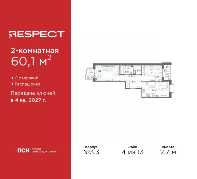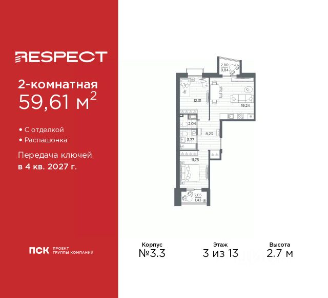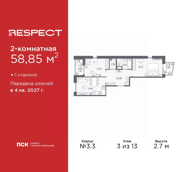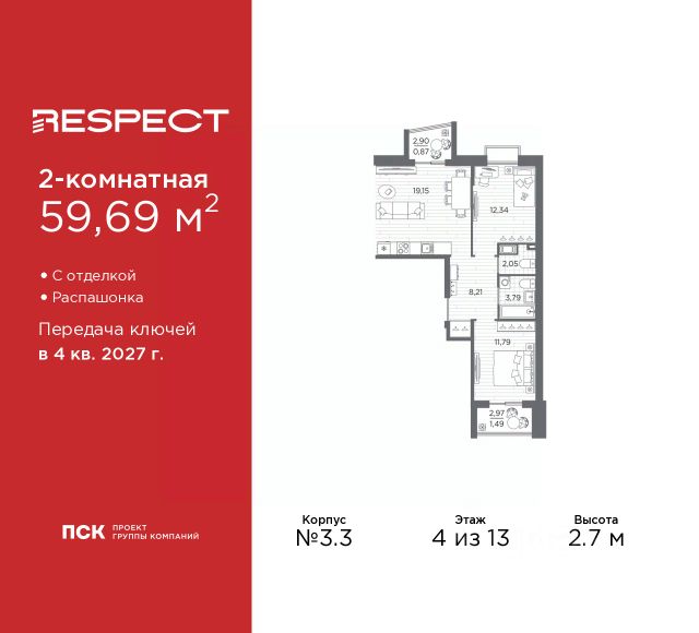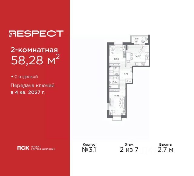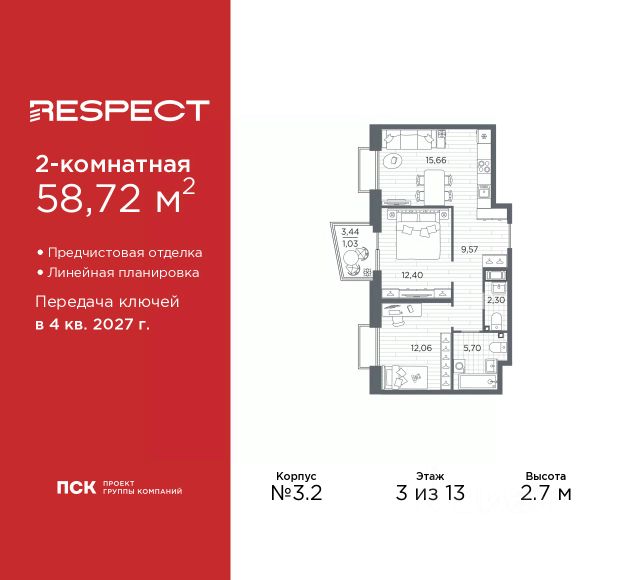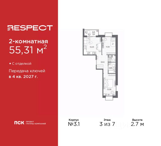Двухкомнатная квартира от застройщика с предчистовой отделкой в ЖК "RESPECT" на 2 этаже. Общая площадь: 56.1 кв.м., жилая: 23.32 кв.м., площадь просторной кухни-столовой: 15.05 кв.м. Комнаты изолированные, все окна выходят на одну сторону. В квартире один балкон и одна лоджия, два совмещенных санузла. Терраса представляет собой роскошную зону отдыха для проведение вечеров в кругу семьи и друзей или организация вечеринок. Высота потолков 2.7 м. Квартира находится в корпусе 6. Дом монолитный, одноподъездный, высотой 13 этажей. На этаже 8 квартир. В подъезде 1 пассажирский и 1 грузовой лифт. Окончание строительства - 4 квартал 2026 года. Оформление сделки по договору долевого участия. В шаговой доступности от жилого комплекса находятся станции метро (расстояние по прямой): "Лесная" (800 м), "Площадь Мужества" (1.4 км), "Выборгская" (1.9 км), также недалеко от этого корпуса находятся станции метро: "Академическая", "Политехническая". Жилой квартал "RESPECT" строится на Полюстровском пр, 87, в одной из самых востребованных локаций Петербурга. В 10 минутах пешком - метро "Лесная" и в 10 минутах на транспорте - Петроградская сторона. Высота домов от 7 до 13 этажей. Квартиры сдаются с отделкой white box и с чистовой отделкой. На территории Respect строится школа на 1125 учащихся и детский сад на 240 мест. Запроектированы собственная газовая котельная, закрытая территория, дворы без машин и подземные паркинги с лифтами. В проекте предусмотрены трапециевидные балконы или остекленные лоджии, которые, с одной стороны, исключают монотонность фасада, являясь декоративными элементами, с другой дополнительным функциональным пространством в квартирах. Цветовая гармония фасадов каждого дома раскрывает характер квартала. Коричневый цвет клинкерного кирпича со структурой водяных штрихов — цвет уюта и безопасности, сдержанности и надёжности. Вентилируемые фасады облицованы клинкерным кирпичом. Его высокая прочность позволяет давать 100 лет гарантии на этот материал. Водопоглощение клинкерного кирпича составляет менее 5%, за счет чего у него высокая теплопроводность и прочность. В квартале запроектированы внутренние закрытые территории дворов домов без доступа автомобилей и безбарьерная среда для велосипедистов и колясок. Предусмотрены IP-домофония с функцией дистанционного открывания калиток и парадных, а также дистанционный сбор показаний счетчиков и мобильное приложение для жителей. Для безопасности жителей квартала - круглосуточное видеонаблюдение и служба охраны. В каждой квартире предусмотрены внешние корзины для кондиционеров. Вся территория квартала будет связана единой концепцией благоустройства, разработанной ландшафтным бюро L.BURO. На эксплуатируемой кровле на уровне первого этажа в домах 1 и 4 будут обустроены общественные видовые террасы. Это станет не только привлекательным местом с красивым видом, но и удобным, многофункциональным пространством. Дизайн парадных зон и входных групп - сочетание лаконичности отделки и декоративных