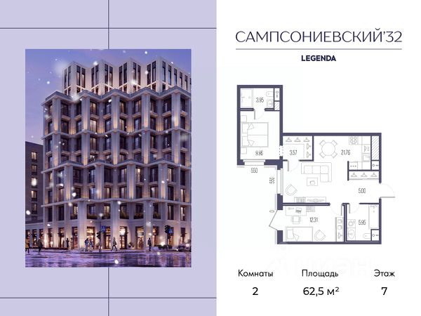 Квартира с двумя спальнями в комплексе "Сампсониевский 32" от LEGENDA на 2 этаже. -Общая площадь: 65.91 кв.м. -Жилая: 24.58 кв.м. -Площадь просторной кухни-столовой: 24.33 кв.м. -Высота потолков 2.7 м. Комнаты изолированные, все окна выходят на одну сторону. В квартире один раздельный санузел. ЖК "Сампсониевский, 32" квартал бизнес-класса в Выборгском районе Санкт-Петербурга недалеко от набережной Большой Невки и Петроградской стороны. Отличают комплекс каскадные фасады с большой площадью остекления, видовые квартиры с террасами. Современные инженерные и технические решения, повышающие качество жизни TechnoBox включают в себя: стационарный и удаленный контроль дома, систему Air Design, обеспечивающую чистый воздух без лишнего шума, мультисервисную сеть, объединяющую коммуникационные системы. Квартиры сдаются с предчистовой отделкой: выровнены пол и стены, проведена электрика, предусмотрена шумоизоляция, встроенная система вентиляции. В каждой квартире установлена взломостойкая входная дверь, окна со специальным термоизолированным алюминиевым профилем. В ЖК "Сампсониевский, 32" много вариантов планировок: квартиры с террасой, мастер-спальней, ванной комнатой с окном, гардеробной комнатой. Двор закрыт от транспорта, здесь будут зоны с дизайнерским оформлением для игр и отдыха. Срок сдачи 4 квартал 2026 года. В отапливаемом подземном паркинге 298 мест, спуститься туда можно на лифте из своей квартиры. Комплекс находится на границе крупных районов, рядом с набережными, которые ведут в Приморский, Калининский и Центральный районы, а через Сампсониевский, Гренадёрский и Кантемировский мосты можно попасть в Петроградский район. До станции метро "Выборгская" 900 м, до станции метро "Петроградская" 2,6 км. Финляндский вокзал находится в 2,5 км от ЖК, а Западный скоростной диаметр (ЗСД) в 10 км. Рядом с ЖК находится несколько гимназий, общеобразовательных школ и детских садов. Здесь много медицинских учреждений, кафе, ресторанов, торговых центров, гипермаркетов. Меньше чем в 1 км от ЖК Сампсониевский и Выборгский сады, а в 2 км находится Ботанический сад, набережная реки Карповки с качелями и зонами отдыха у воды.