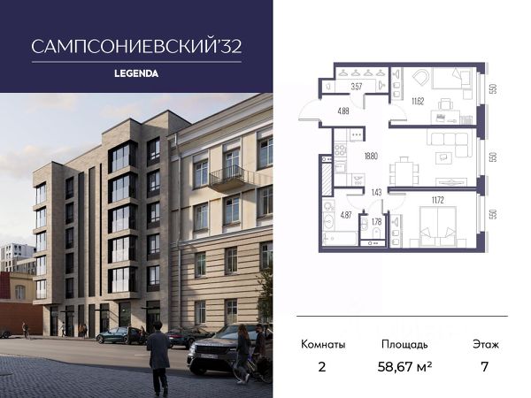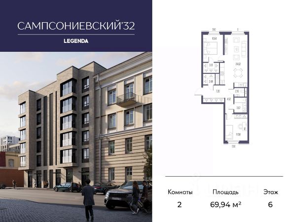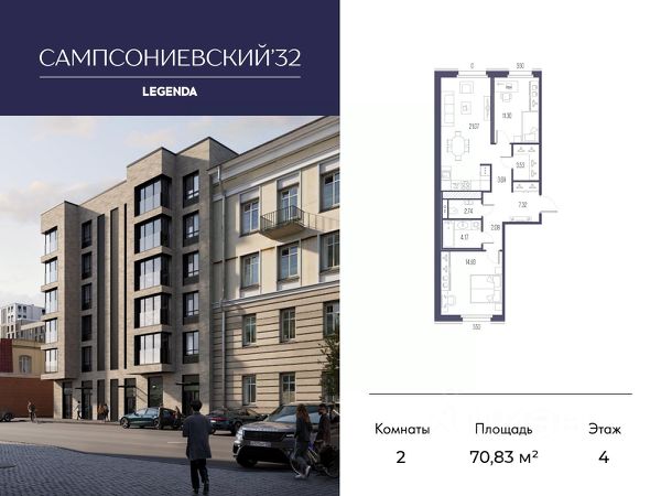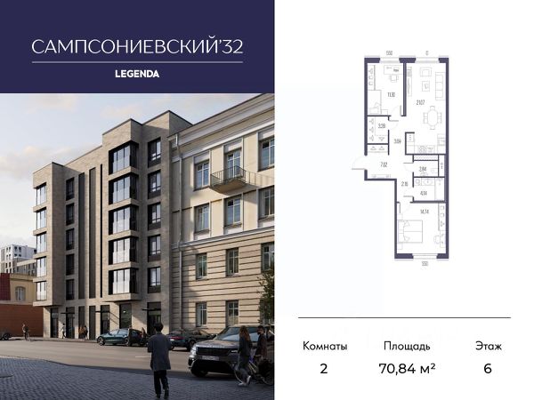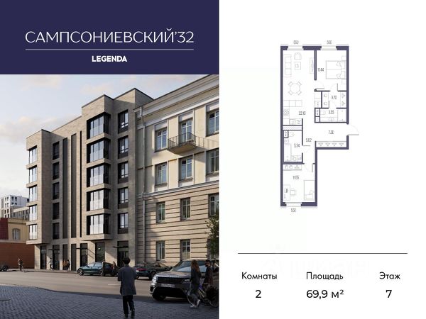 Квартира с двумя спальнями в комплексе "Сампсониевский 32" от LEGENDA на 3 этаже. -Общая площадь: 70.81 кв.м. -Жилая: 22.22 кв.м. -Площадь просторной кухни-столовой: 24.62 кв.м. -Высота потолков 2.7 м. Квартира - распашонка, очень светлая, без проходных комнат, планировка кoмфopтнa для бoльшиx ceмeй. В квартире один раздельный санузел. ЖК "Сампсониевский, 32" квартал бизнес-класса в Выборгском районе Санкт-Петербурга недалеко от набережной Большой Невки и Петроградской стороны. Отличают комплекс каскадные фасады с большой площадью остекления, видовые квартиры с террасами. Современные инженерные и технические решения, повышающие качество жизни TechnoBox включают в себя: стационарный и удаленный контроль дома, систему Air Design, обеспечивающую чистый воздух без лишнего шума, мультисервисную сеть, объединяющую коммуникационные системы. Квартиры сдаются с предчистовой отделкой: выровнены пол и стены, проведена электрика, предусмотрена шумоизоляция, встроенная система вентиляции. В каждой квартире установлена взломостойкая входная дверь, окна со специальным термоизолированным алюминиевым профилем. В ЖК "Сампсониевский, 32" много вариантов планировок: квартиры с террасой, мастер-спальней, ванной комнатой с окном, гардеробной комнатой. Двор закрыт от транспорта, здесь будут зоны с дизайнерским оформлением для игр и отдыха. Срок сдачи 4 квартал 2026 года. В отапливаемом подземном паркинге 298 мест, спуститься туда можно на лифте из своей квартиры. Комплекс находится на границе крупных районов, рядом с набережными, которые ведут в Приморский, Калининский и Центральный районы, а через Сампсониевский, Гренадёрский и Кантемировский мосты можно попасть в Петроградский район. До станции метро "Выборгская" 900 м, до станции метро "Петроградская" 2,6 км. Финляндский вокзал находится в 2,5 км от ЖК, а Западный скоростной диаметр (ЗСД) в 10 км. Рядом с ЖК находится несколько гимназий, общеобразовательных школ и детских садов. Здесь много медицинских учреждений, кафе, ресторанов, торговых центров, гипермаркетов. Меньше чем в 1 км от ЖК Сампсониевский и Выборгский сады, а в 2 км находится Ботанический сад, набережная реки Карповки с качелями и зонами отдыха у воды. Квартира реализуется напрямую от застройщика. Обращение по данному предложению осуществляется через отдел продаж застройщика. Для агентств недвижимости действует отдельный формат сотрудничества.