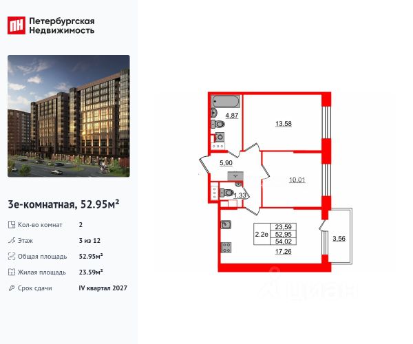 • ✓ Студии, 1-3-комнатные от 50,7 м² до 53,2 м² м²