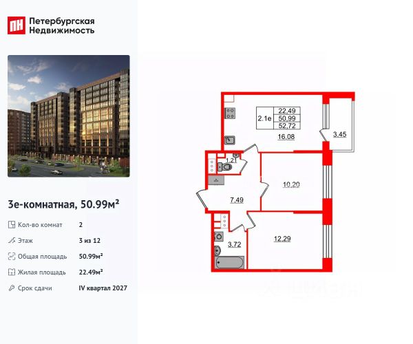 • ✅ Минимальная площадь: 50,7 м² м² (студии в наличии)
