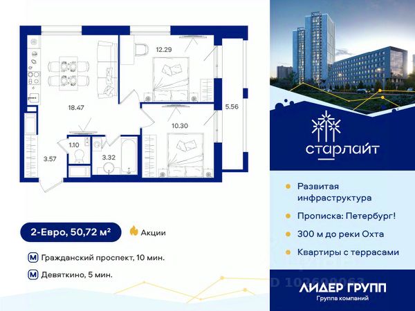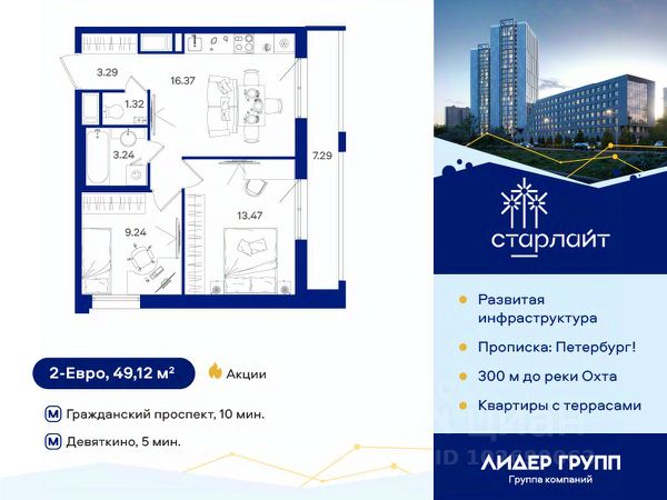 -До станции метро Девяткино 6 минут на транспорте или 18 минут пешком