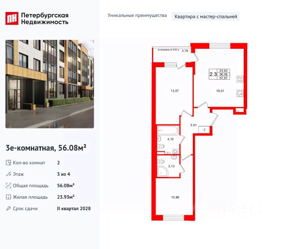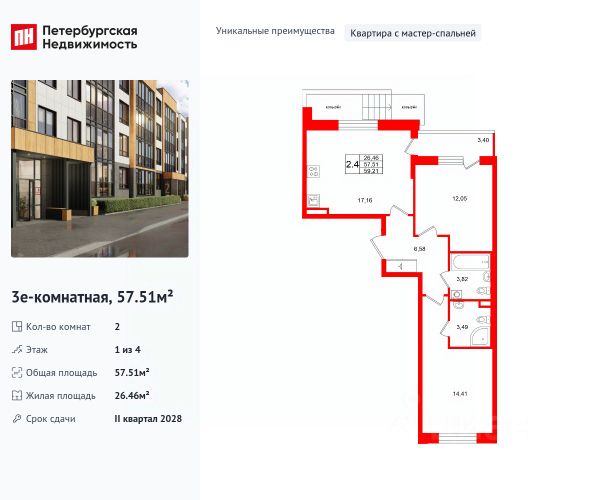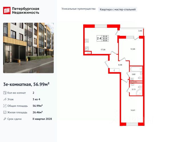 Продается уютная 2-комнатная квартира от застройщика в жилом комплексе "Univer City" в на юге Санкт-Петербурга. До метро можно добраться на транспорте всего за 30 минут. Мастер-спальня с собственной ванной комнатой. Самое приватное пространство в вашей квартире. Уникальная, функциональная европланировка, большая кухня-гостиная 17.47 м², вместительная прихожая 6.17 м². Общая площадь квартиры - 56.99 м², жилая 26.36 м², высота потолка 2.77 м. Квартира продается с отделкой "Норд Лайн серый". Что особенного в ЖК "Univer City"? • Малоэтажное строительство • Скандинавские фасады с отделкой керамогранитом, акцентные входные группы • Закрытые внутренние дворы без машин • Пешеходный променад с тематическими зонами, еловый сквер и яблоневый сад • Univer Park, включая SetlSport и SetlKids, площадку для выгула собак и зоны отдыха • Инновационный Лицей Setl с оригинальной архитектурной концепцией и уникальной образовательной средой