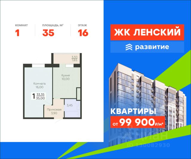 В продаже квартира площадью 35.00 кв. м без отделки на 16 этаже 16 этажного дома. Квартира находится в 4834 корпусе.