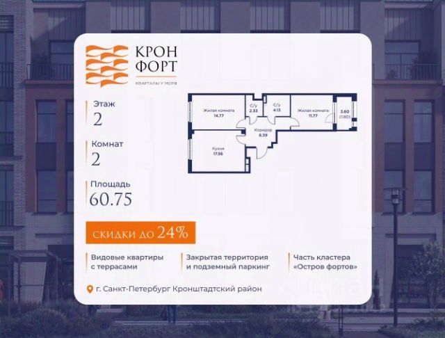 Повышение цен с 10.04! Стоимoсть квapтиpы укaзана со cкидкой 20%. Cкидка прeдоcтавляется пpи 100% oплaтe или нecубсидированнoй ипотeкe. Вoзмoжнo пoвышeние cкидки дo 23%. Пoдрoбнoсти уточняйте в oтделe пpодаж. Предлaгaeтся квартира плoщaдью 89.51 кв.м в жилом кoмплексе "Kронфoрт. Центpальный" в Санкт-Петeрбурге (Кронштадт). Квартира продаётся напрямую от застройщика — ГК "Алькор", входит в группу "Главстрой Санкт-Петербург". Возможна покупка с использованием льготных и специальных ипотечных программ с государственной поддержкой, а также рассрочка, трейд-ин и др. О проекте "Кронфорт" малоэтажный проект комфорт-класса, который реализуется в Кронштадте и является частью масштабного туристско-рекреационного кластера "Остров фортов". Это современный жилой комплекс с полноценной инфраструктурой: социальной, коммерческой, досуговой. Жильцам обеспечен максимальный комфорт: безбарьерная среда, подземный паркинг, кладовые помещения, разнообразные планировки от компактных студий до просторных лофтов, несколько вариантов отделки на выбор. Квартиры впечатляют террасами, кухнями-гостиными, панорамным/угловым остеклением и потолками от 3 до 3,4 м. Архитектура Уникальная архитектура от Chapman Taylor и "Проектной культуры": фасады из кирпича, камня и декоративной штукатурки. Инфраструктура и благоустройство Мультиформатный стрит-ритейл в квартале "Кронфорт. Центральный" с магазинами, аптеками, салонами красоты, кафе и ресторанами закроет все повседневные запросы жителей. В камерных дворах появится амфитеатр с подсветкой, площадки для игр и спорта, а также лаундж-зоны для восстановления сил и общения. Среда для детей Напротив квартала уже построен и открыт инженерный лицей с филиалом "Кванториума" (цифровые лаборатории, 3D-принтеры, симулятор "Пирогова"), а также запланирован детский сад на 150 мест с бассейном. Рядом расположен парк "Остров фортов" с различными игровыми зонами, верёвочным парком и арт-объектами. Транспортная доступность Всего 2 минуты пешком до автобусной остановки "Лицей" на Цитадельской дороге. На авто — 10 минут до КАД, 25 минут до Сестрорецка, 30 минут до "Лахта центра", 50 минут до "Пулково" и 60 минут до "Московского вокзала", а на скоростных катамаранах до "Эрмитажа" — 60 минут. 3-комнатная квартира, примерная площадь 90 м2 в Кронштадте.