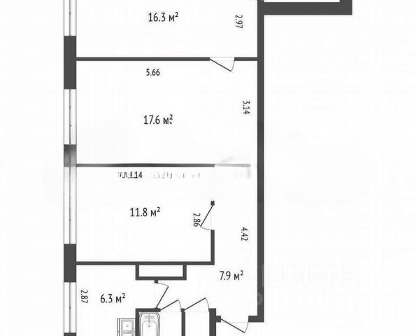 Планировка: две изолированные спальни 17,2 и 12,8 кв.м, гостиная 17,8 кв.м, кухня 6,3 кв.м, гардеробная с высоким потолком: 1,2 кв.м, санузел 3,1 кв.м.