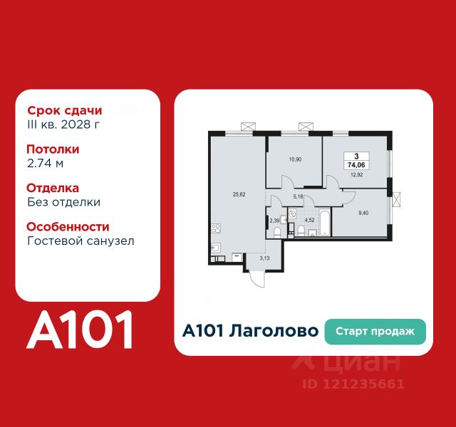 Старт продаж! 3-комнатная квартира площадью 71.07 в ЖК "А101 Лаголово" на 6 этаже. Квартира без отделки. Вид из окна на улицу. В квартире 2 санузла. Высота потолков 2.74 м. Особенность планировки - гардеробная. Предложения от застройщика на декабрь 2025: - Гибкая рассрочка 20 000 руб/мес. и первым взносом 10%. ОТДЕЛКА Квартира передается без отделки. Благодаря тому, что в данном типе отделки стены не возводятся, вы сможете создать удобную планировку и самостоятельно организовать зонирование комнат. ОСОБЕННОСТИ ПЛАНИРОВКИ Из окон квартиры открывается живописный вид на зелёный пешеходный бульвар, который строится одновременно с домами. Места для хранения находятся в прихожей и жилой зоне квартиры, дополнительно можно получить доступ к кладовым на подземном уровне (площадь - 2-8 кв. м). ПАРАДНАЯ. В каждой парадной предусмотрены места для хранения велосипедов и колясок, гостевой санузел и удобная зона ожидания для гостей. ДВОРЫ И ОКРУЖЕНИЕ. Просторные дворы безопасны для детей, так как свободны от машин, закрыты от посторонних и постоянно находятся под видеонаблюдением. Во дворах создается разнообразная среда для детей всех возрастов: детские площадки с батутами, тактильными дорожками и игровыми комплексами. Для активного отдыха - воркаут-площадки, столы для пинг-понга и газоны для занятий йогой. Во дворах есть и тихие уголки - зеленые гостиные с уличной мебелью, где можно поработать на свежем воздухе или отдохнуть в тишине. Из внутренних дворов комплекса можно выйти на пешеходный бульвар длиной около 900 метров. Здесь будет организовано полноценное общественное пространство с амфитеатром, уличным кафе, ручьем, фонтаном и множеством мест для отдыха и игр. Большую часть бульвара займут благоустроенные зеленые зоны и теневые сады из десятков видов деревьев и кустарников, многолетних цветов и трав, которые будут радовать глаз круглый год. "А101 Лаголово" - современный город у подножия знаменитых Дудерговских высот, в объятиях чистейших озер и зеленых живописных массивов, наполненный всем необходимым для счастливой жизни. ИНФРАСТРУКТУРА. Мы занимаемся комплексным освоением территории. Наш приоритет - доступность всех сервисов для счастливой жизни. 1. Лаголово-город 15-ти минутной доступности. Вся необходимая инфраструктура: магазины, салоны красоты, образовательные учреждения, медицинские центры находятся в 15-ти минутах пешей прогулки от любой точки жилого комплекса. Это позволяет не тратить время на долгие перемещения. 2. Представьте идеальный город, где ребенок может спокойно играть, а пожилой человек наслаждаться заслуженным отдыхом. Жилая среда нашего комплекса может комфортно использоваться как 8-летним ребенком, так и 80-летним пожилым человеком. Дома, улицы, общественные пространства, тротуары спроектированы с заботой о людях разных возрастов. 3. Мы активно развиваем авторскую образовательную экосистему "Лёрнити". Она включает строительство 8 современных детских садов (2000 мест) и 3 школ (2945 учащихся). Мы учим родителей гармонично