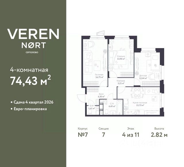 Успейте забронировать на этих условиях! Срок акции ограничен! Стоимость квартиры указана со скидкой, ваша экономия составит 1,407,222 RUB. Информация по телефону, наши менеджеры вам все расскажут! 3-комн. квартира в Veren Nort Сертолово на 4 этаже. Квартира без отделки, полностью готова к ремонту. Общая площадь: 74.43 кв.м., жилая: 43.09 кв.м., площадь просторной куxни-гостиной: 15.73 кв.м. Угловая квартира, очень светлая, естественная вентиляция при открытии окон. В квартире один совмещенный и один раздельный санузел. Высота потолков 2.82 м. Квартира находится в корпусе 7. Дом монолитный, одноподъездный, высотой 11 этажей. На этаже 14 квартир. В подъезде 1 пассажирский и 1 грузовой лифт. Окончание строительства - 4 квартал 2026 года. Оформление сделки по договору долевого участия. Евро-планировка, вид на приватный двор. Сочетание современной архитектуры и отличной экологии севера Лен. области. Выразительный облик домов разработан именитым архитектурным бюро "Остоженка". Характеристики жилого комплекса исключительны: продуманный ландшафтный дизайн, оригинальные парадные, разработанные по индивидуальному дизайн-проекту, современные детские и многофункциональные спортивные площадки, летний кинотеатр под открытым небом, два детских сада. Комплекс создается в уже сложившейся инфраструктуре г. Сертолово и обладает удобным транспортным сообщением с Санкт-Петербургом. В 300 метрах от "VEREN NORT сертолово" планируется транспортно-пересадочный узел "Сертолово", который обеспечит удобную железнодорожную связь с Финляндским вокзалом Санкт-Петербурга. #z4E7ow