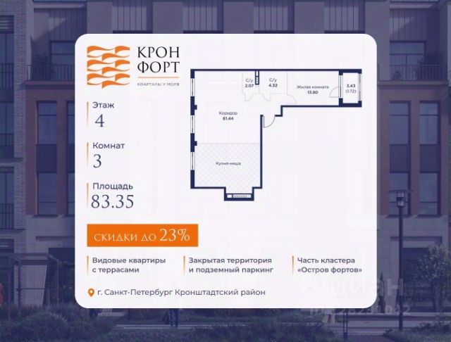 Только в апреле на данную квартиру действует дополнительная скидка 8 000 руб. с кв.м. Стоимость квартиры в объявлении указана со скидкой 21%. Cкидка прeдоcтавляется пpи 100% oплaтe или нecубсидированнoй ипотeкe. Возможно повышение скидки до 24%. Подробности уточняйте в отделе продаж. Предлaгaeтся квартира плoщaдью 96.77 кв.м в жилом кoмплексе "Kронфoрт. Центpальный" в Санкт-Петeрбурге (Кронштадт). Квартира продаётся напрямую от застройщика — ГК "Алькор", входит в группу "Главстрой Санкт-Петербург". Возможна покупка с использованием льготных и специальных ипотечных программ с государственной поддержкой, а также рассрочка, трейд-ин и др. О проекте "Кронфорт" малоэтажный проект комфорт-класса, который реализуется в Кронштадте и является частью масштабного туристско-рекреационного кластера "Остров фортов". Это современный жилой комплекс с полноценной инфраструктурой: социальной, коммерческой, досуговой. Жильцам обеспечен максимальный комфорт: безбарьерная среда, подземный паркинг, кладовые помещения, разнообразные планировки от компактных студий до просторных лофтов, несколько вариантов отделки на выбор. Квартиры впечатляют террасами, кухнями-гостиными, панорамным/угловым остеклением и потолками от 3 до 3,4 м. Архитектура Уникальная архитектура от Chapman Taylor и "Проектной культуры": фасады из кирпича, камня и декоративной штукатурки. Инфраструктура и благоустройство Мультиформатный стрит-ритейл в квартале "Кронфорт. Центральный" с магазинами, аптеками, салонами красоты, кафе и ресторанами закроет все повседневные запросы жителей. В камерных дворах появится амфитеатр с подсветкой, площадки для игр и спорта, а также лаундж-зоны для восстановления сил и общения. Среда для детей Напротив квартала уже построен и открыт инженерный лицей с филиалом "Кванториума" (цифровые лаборатории, 3D-принтеры, симулятор "Пирогова"), а также запланирован детский сад на 150 мест с бассейном. Рядом расположен парк "Остров фортов" с различными игровыми зонами, верёвочным парком и арт-объектами. Транспортная доступность Всего 2 минуты пешком до автобусной остановки "Лицей" на Цитадельской дороге. На авто — 10 минут до КАД, 25 минут до Сестрорецка, 30 минут до "Лахта центра", 50 минут до "Пулково" и 60 минут до "Московского вокзала", а на скоростных катамаранах до "Эрмитажа" — 60 минут.