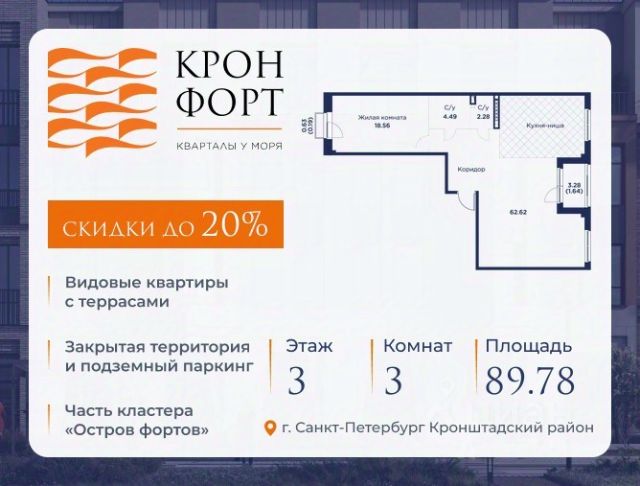 Стоимость квартиры указана со скидкой 20%. Скидка предоставляется при 100% оплате или несубсидированной ипотеке. Предлагается квартира площадью 79.41 кв.м в жилом комплексе "Кронфорт. Центральный" в Санкт-Петербурге (Кронштадт). Возможна покупка с использованием льготных и специальных ипотечных программ с государственной поддержкой. Высота потолков в квартирах — от 3 до 3,4 метров, окна увеличенного размера, есть варианты с эркерами, французскими балконами, лоджиями и террасами. Жилой квартал состоит из пяти четырехэтажных корпусов с закрытыми охраняемыми дворами, свободными от машин. Первые этажи формируют торговые променады в стиле пешеходных улиц исторической части Петербурга и Кронштадта. Внутренние пространства между корпусами — пешеходные зоны с уютными площадями. Архитектурный облик квартала разработан бюро "Проектная культура" и международной компанией Chapman Taylor. Инфраструктура комплекса включает: - Лицей с двумя бассейнами - Детский сад на 150 мест с бассейном и закрытой территорией - Веревочный парк - Игровые площадки для активного отдыха; - Кабинет врача общей практики. - Подземные паркинги с лифтами. - Мусоросборные камеры, индивидуальные кладовые. - Закрытые дворы с контролем доступа и видеонаблюдением. - Мультформатный стрит-ретейл с кафе и ресторанами. - Триатлон-центр и беговые/велодорожки. - Учебно-тренировочный комплекс для детей "Лагерь настоящих героев". Транспортная доступность обеспечивает удобный выезд на КАД (около 1-3 км), 2 минуты пешком до автобусной остановки "Лицей", 25 минут до Сестрорецка, 30 минут до "Лахта-центра", 50 минут до аэропорта "Пулково" и 60 минут до Московского вокзала. Для любителей моря доступен маршрут на "Метеоре" до центра Санкт-Петербурга. Отделка квартир предлагается как с готовой чистовой отделкой, так и со свободной планировкой без отделки для реализации индивидуальных дизайнерских решений. В третьем корпусе, продажи которого стартовали в марте 2025 года, доступны квартиры с просторными террасами, тремя балконами, кухнями-гостиными до 38 кв.м с окнами на две стороны, обеспечивающими панорамное освещение и виды. Если вам нужна помощь с оформлением ипотеки или дополнительная информация по комплексу и условиям покупки, обращайтесь в отдел продаж за консультацией.