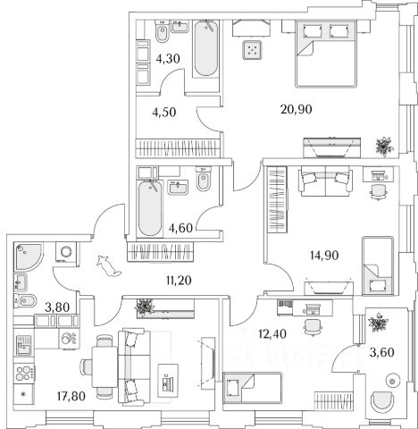 Комнаты-19,6+10,9+11,5кв.м.;
