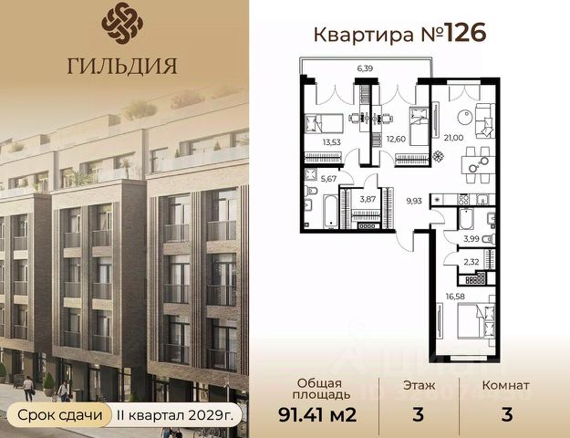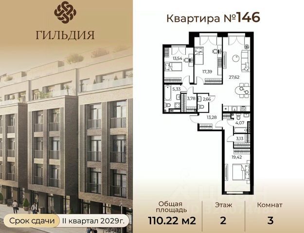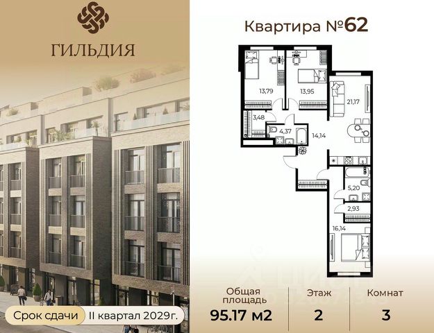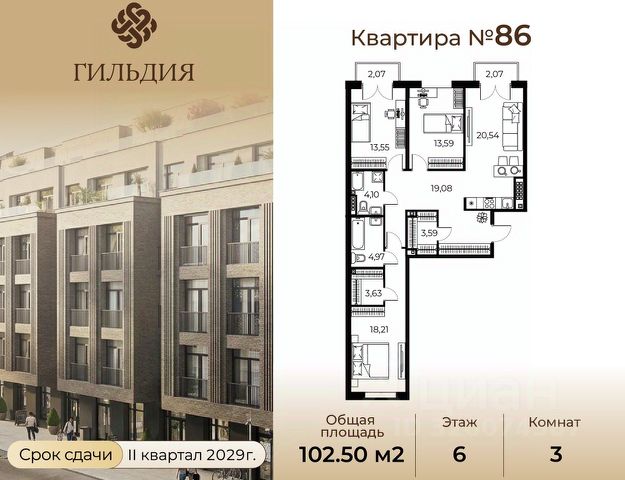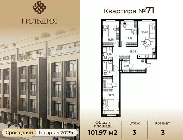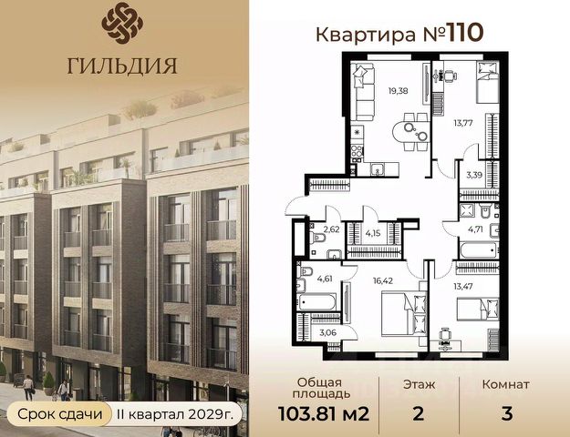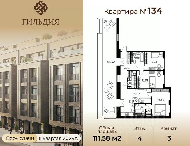 Общая площадь квартиры составляет 111,6 кв.метров, а жилая — 64,2. Просторные комнаты (21,3 + 23,1 + 19,8 кв.м) и уютная кухня (10,6 кв.м) создают идеальные условия для комфортной жизни и встреч с близкими.