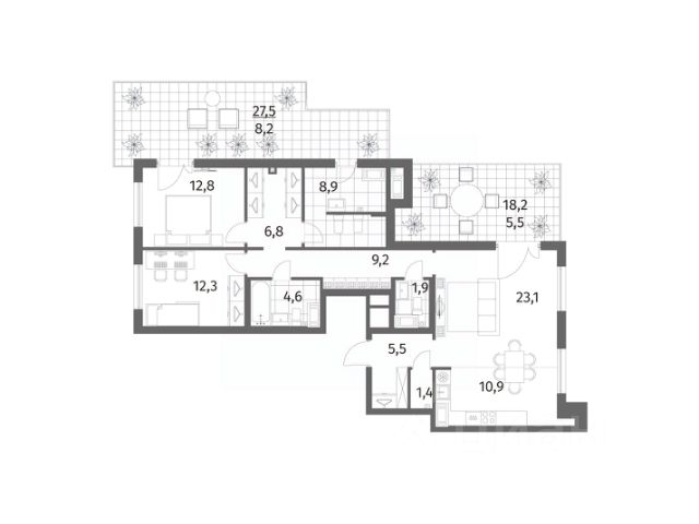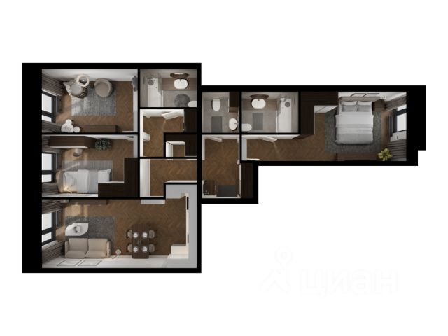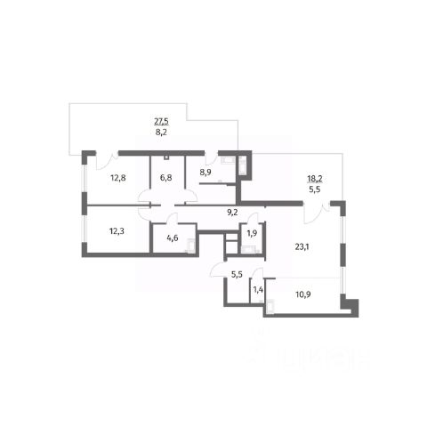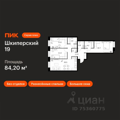 Общая площадь 112 кв.м., просторная кухня-гостиная 30 кв.м. с ЭРКЕРОМ, мастер-спальня (свой санузел 9 кв.м. ! и гардеробная 6 кв.м. !) 20 кв.м. с тремя окнами и выходом на лоджию! две отдельные комнаты правильной формы 14 кв.м. с выходом на лоджию и 12 кв.м. соответственно, раздельный санузел, большая прихожая 14 кв.м.