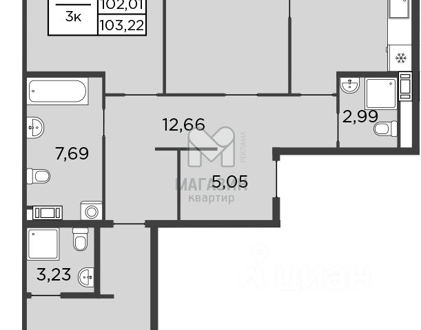 Общая площадь квартиры составляет 111,6 кв.метров, а жилая — 64,2. Просторные комнаты (21,3 + 23,1 + 19,8 кв.м) и уютная кухня (10,6 кв.м) создают идеальные условия для комфортной жизни и встреч с близкими.