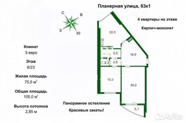Преимущества квартиры:Просторная 3-евро квартира 105 м2!Свободная планировка, возможность спроектировать планировку по своему дизайну!Большая просторная кухня-гостиная 22 кв. м., мечта любой хозяйки!Просторные жилые комнаты 30 кв. м и 18 кв. м правильной прямоугольной формы, с возможностью организовать гардеробную, комната с гардеробной!Панорамное остекление в пол в Кухне-гостиной и большой комнате!Остекление полностью заменено на теплое!ВИДОВАЯ КВАРТИРА! Из окон открывается красивый вид на шикарные закаты, на Лахта центр, Юнтоловский заказник! Окна на улицу на парковую зону и во двор,Просторная прихожая 18 кв.м. Просторная прихожая это редкость в современных планировках, позволяет организовать пространство удобным для Вас способом с местом для хранения! гардеробной! или даже спальней или зоной отдыха,Просторные санузлы, возможность организовать 2 раздельных санузла!В квартире произведена разводка электрикиВ квартире предусмотрена возможность установки перегородок, дополнительного зонированияквартира продается без отделкиПреимущества дома:Кирпично-монолитный качественный дом 2010 года от хорошего застройщика!НА этаже ВСЕГО 4 КВАРТИРЫ! Это значит будет тихо и чисто!хорошие соседи!КРАСИВЫЙ ДОМ с архитектурной точки зрения!Хорошие лифты пассажирский и грузовой,видеонаблюдение в лифтах и по периметру дома,Удобная транспортная доступность до центра города и в любой район! до метро Комендантский проспект 10 мин на транспортерядом выезд на ЗСД, что позволяет быстро добраться в любую точку города, и быстро выехать за город,Во дворе подземный паркинг, и открытая парковкав пешей доступности: школы, детские сады, пекарни, магазины, автобусные остановки и большой ТЦ "Монпансье". Также в самом доме есть галерея с магазинами,Во дворе детская площадкаРядом парк, прогулочные тропы, река, здесь устраивают пикники, катаются на велосипедах, роликах, зимой на ватрушках и коньках!В районе также отличные парки, 15 минут на машине: парк 300-летия Санкт-Петербурга, ЦПКиО, парк Озеро Долгое, Юнтоловский заказник, Непосредственно Рядом с домом отличное место для отдыха и прогулок!ДОКУМЕНТЫ:В Собственности более 5 лет, покупали у ЗастройщикаБез обременений, Мат кап не использовался, без ипотекиникто не прописан1 взрослый собственникготовность к сделкевся сумма в договореБезопасная сделка в сопровождении