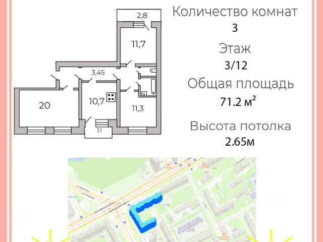 Адрес: Санкт-Петербург, Петергоф, Ропшинское шоссе, д. 11Тип дома: кирпичныйЭтаж: 3 из 5 (без лифта)Общая площадь: 68,5 м²Жилая: 37,3 м²Кухня: 11,2 м²Окна: на две стороны Описание:Продаётся 3-комнатная квартира в тёплом кирпичном доме в спокойном районе Петергофа. Квартира требует ремонта — отличный вариант для тех, кто хочет оформить интерьер под себя. Просторная кухня и удобная планировка, окна выходят на две стороны. Инфраструктура развита: рядом школы, магазины, поликлиника, остановки общественного транспорта. Удобный выезд в город, рядом зелёные зоны и исторические парки. Преимущества:— Кирпичный дом с хорошей звукоизоляцией— Светлая квартира с большой кухней— Экологически чистый район Петергофа 1 взрослый собственник Встречная покупка Полная стоимость в договоре . Звоните, чтобы узнать подробности и договориться о просмотре!