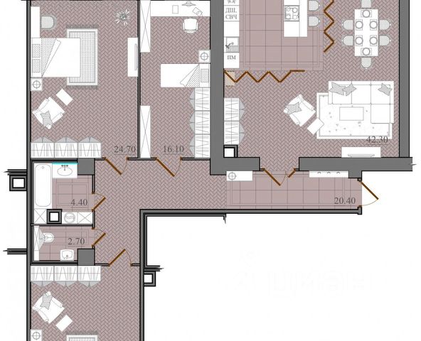Квартира большей своей частью обращена на фасад здания, а также во двор, при этом окна в квартире располагаются на три стороны. Высокие потолки 3,65, множество окно создают ощущение поистине дворца. Несущие в квартире только колонны, что позволяет обустроить внутреннее пространство по своему усмотрению и сделать ту планировку, которая вам по душе (две спальни и огромная кухня-гостиная, три спальни, кабинет и просторная зона кухни-столовой или же предусмотреть разделение на две отдельные квартиры). В квартире имеется два вместительных санузла, которые разнесены в разные части квартиры, большой хол, при входе две зоны для гардеробной.