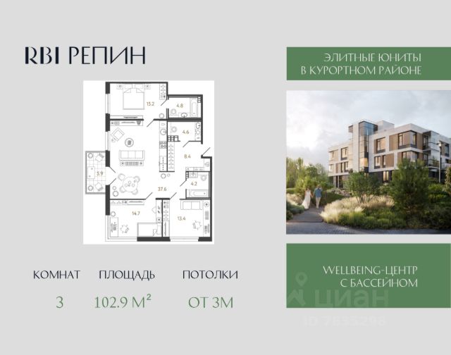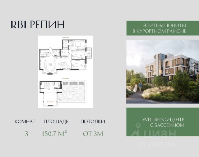 "Репин" — элитный лаунж-комплекс от RBI в Курортном районе Петербурга в посёлке Репино по адресу Приморское шоссе, 441. Шоссе считается петербургским аналогом трассы Канны Ницца Монако. Вместо пиний — сосновый лес, который сменяется открытыми морскими видами хотя и не Средиземного моря, но такого же просторного Финского залива. Проезжая по Приморскому шоссе, вы уже отдыхаете. После Репинских Пенатов дорога круто поворачивает к югу и совершает плавную дугу к западу — именно здесь в 400 метрах от залива располагаются роскошные виллы вэлнес-комплекса "Репин". Формат проживания камерный — без суеты и лишнего шума. В четырёх виллах всего 84 сити-хауса. Есть номера с палисадниками и отдельным входом, лоты с террасами и возможностью установки дровяного камина, двухэтажные юниты с двусветной кухней-гостиной, высота потолков в которой достигает 6,3 или 6,6 метров. На типовых этажах потолки 3 метра, на последнем этаже — 3,3 метра. Площадь юнитов от 45,8 до 150,7 м² — можно приобрести инвестиционный лот под сдачу в аренду или купить номер для собственного роскошного проживания. Конструкция стен продумана таким образом, чтобы вы могли реализовать перепланировку пространства вплоть до объединения соседних юнитов с сохранением высокой звукоизоляции между номерами. На территории комплекса находятся ещё два инфраструктурных корпуса — они располагаются вдоль шоссе и создают визуальный и акустический барьер для вилл. В первом корпусе находятся центральная входная группа с ресепшн и зоной ожидания гостей, ресторан с отдельным входом и wellbeing-центр, где оборудуют спортзал, бассейн, хамам и сауну. Всё, чтобы вы могли переключиться от рутины и обрести себя заново! Во втором корпусе — трёхуровневый паркинг на 60 машиномест. Ещё 10 м/м на уличной автостоянке. Все виллы — малоэтажные и размещены в шахматном порядке, чтобы вы могли наблюдать умиротворяющий пейзаж прямо из окон или с террасы своего номера. Лаконичная скандинавская архитектура вторит окружению и способствует расслаблению, а декоративная ландшафтная подсветка преображает комплекс в сумерки. Приватная охраняемая территория утопает в зелени: равнины перемежаются с живописными холмами, создавая аллюзию на пейзажный парк. Среди всей этой красоты благоустроены разнообразные лаунжи: две открытые площадки для встреч у костра и обогреваемая фуршетная зона, подиум с деревянными шезлонгами и декоративный водоём с кинетической скульптурой от Владислава Муханова и Ивана Зубарева. Дети могут играть на экологичной детской площадке во дворе, а спортсмены — заниматься на профессиональных уличных тренажёрах FOREMAN. Refresh-коплекс "Репин". Ваш источник безмятежности в лоне природы побережья Финского залива!