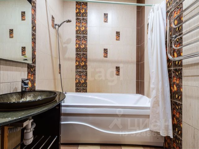 - ванная комната в кафельной плитке с дизайнерскими обоями, оснащена вместительной ванной, инсталляцией и теплом полом,