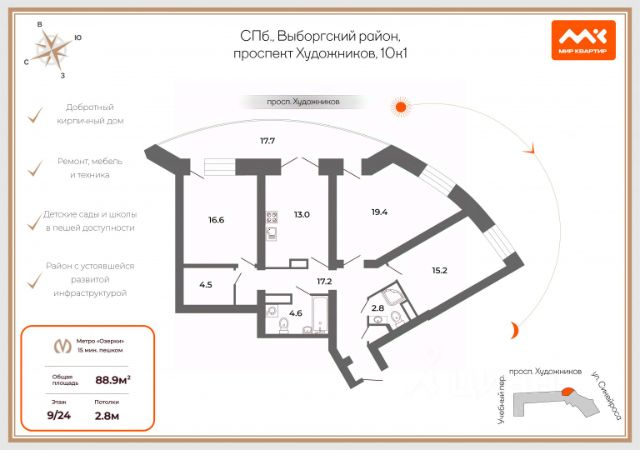 Код объекта: 2060252. Продается светлая теплая ккв с шикарным дизайнерским ремонтом. Делали под себя. Капитальный ремонт. Заменено все: от коммуникаций, стояков и проводки до стеклопакетов. Установлена система "АКВАСТОП" ПРО КВАРТИРУ: Теплый пол в коридоре, сан узле и на кухне Дорогой дубовый паркет Кондиционеры в каждой комнате и даже на балконе Измельчитель пищевых отходов в раковине Увеличенный санузел с местом для стиральной и сушильной машины Бойлер Утепленный большой балкон ПРО ДОМ: Добротная 9 этажка с новым лифтом Порядочные дружелюбные соседи Тамбур на 3 квартиры Зеленый двор ПРО ЛОКАЦИЮ: 4-5 остановок до ближайшего метро. Ст. М етро Озерки и Пр. Просвещения (синяя ветка) и до м. Гражданский пр. (красная ветка) Детские сады и школы во дворе. Поликлиника 5 мин пешком В 7 минутах пешком Живописный Муринский парк и Сосновка, Кинотеатр и Аква Парк в ТРК РОДЕО Драйв Зеленый Выборгский район. Всегда найдете место в детском саду или школе. Одобрим ипотеку от 13.9% Звоните и записывайтесь на просмотр прямо сейчас! Купить 3-комнатную квартиру с большим балконом в Санкт-Петербурге.